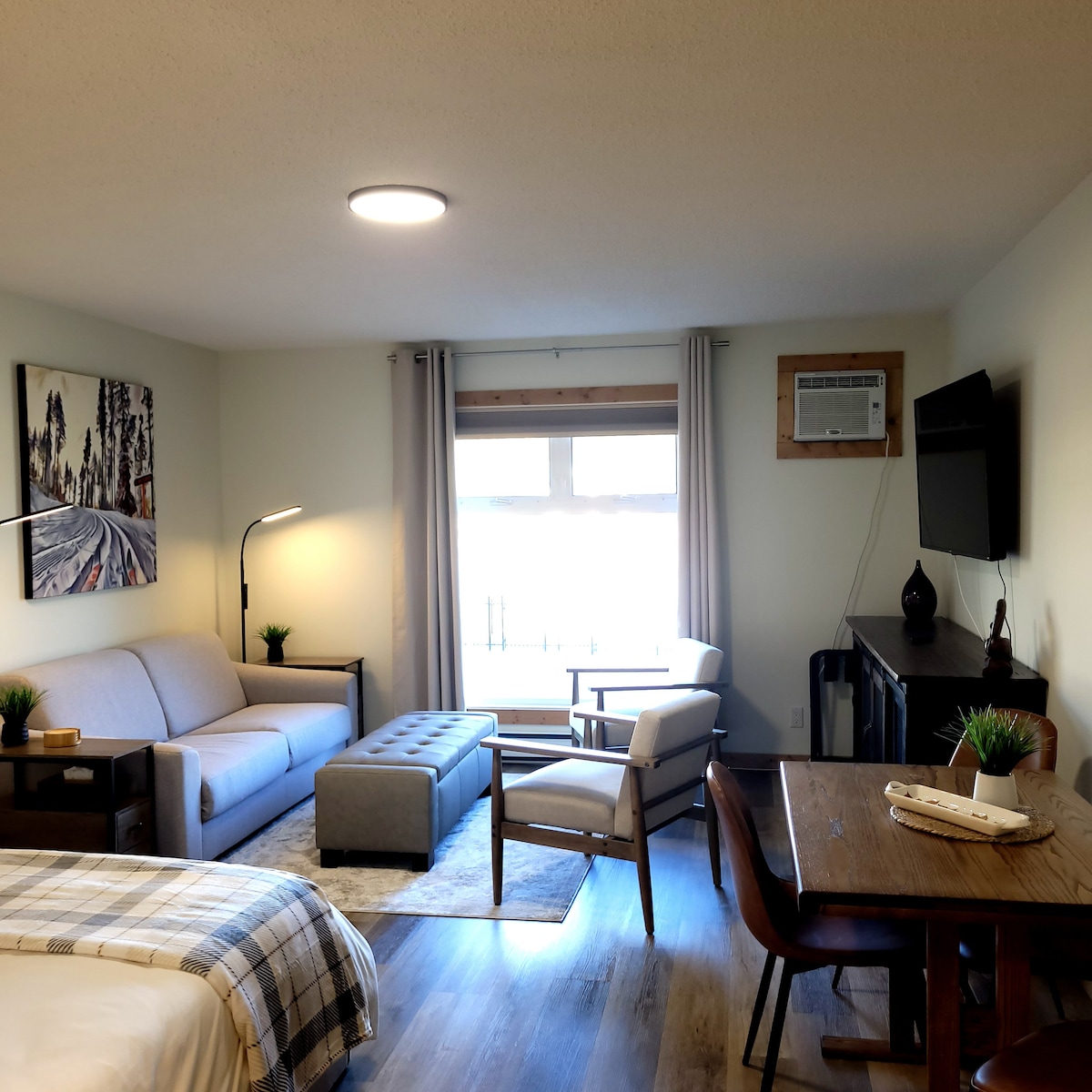 This freshly renovated suite features a kitchenette and a King-Koil queen-size bed. The many conveniences include an HD smart TV, high-speed internet, BBQ, and ski locker. Located along the Elk River, only a three-minute drive to Fernie Alpine Resort or Mt. Fernie Provincial Park and a quick jaunt to Historic Downtown Fernie. Whether you are staying one night, a week, or a month, this is the perfect space for your business trip or mountain getaway!