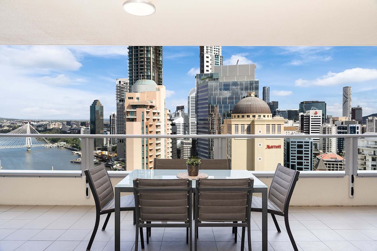 Atsipalaiduokite su šeima mūsų nuostabiame 3 miegamųjų 2 vonios kambario bute Brisbane. Mėgaukitės nuostabiais upės ir miesto vaizdais iš mūsų balkono ir mėgaukitės buto teikiamais patogumais ir prabangiais patogumais. 34-ame aukšte yra atviro plano virtuvė ir svetainė, pagrindinis miegamasis su dvigule lova, vonios kambarys ir tiesioginis išėjimas į erdvų balkoną, antras miegamasis su dvigule lova ir trečias miegamasis su 2 karališkomis viengulėmis lovomis. Pasiteiraukite dėl didesnių grupių užsakymų,daugiau laisvų butų.