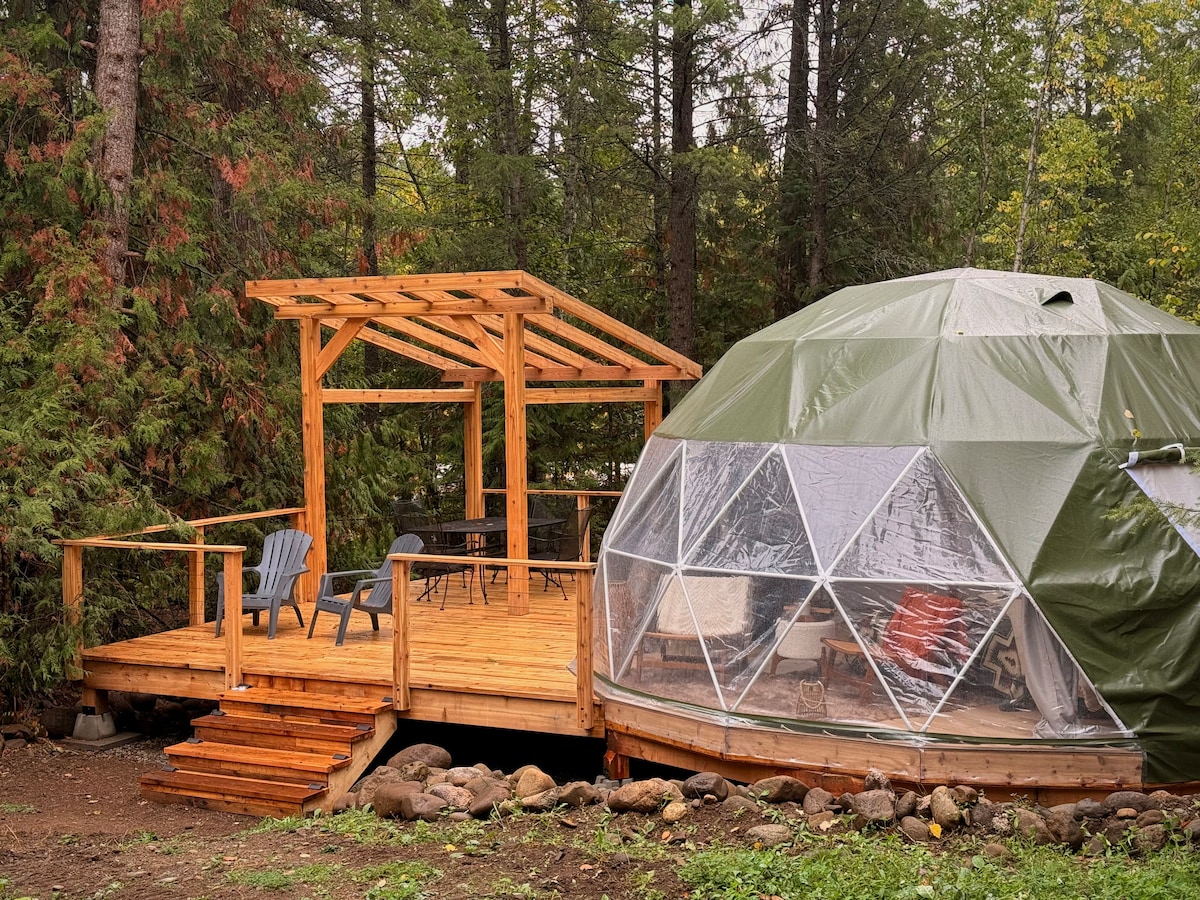 Jums patiks šis unikalus ir romantiškas pabėgimas. Patirkite glampingą kaip niekada anksčiau šiame stilingame ir jaukiame geodeziniame kupole, apsuptame nuostabių Wells Gray parko vaizdų. Yra karališko dydžio lova, šildytuvas ir didelė terasa, kurioje galima mėgautis saulėlydžiu prie laužavietės. Atkreipkite dėmesį: kupolas dienos metu labai įkaista, bet naktį atvėsta. Įsikūręs ramioje stovyklavietėje su bendrais vonios kambariais ir dušais, privačiu ežeru, pirtimi ir 9 duobučių golfo aikštele. Netoli yra kriokliai ir pėsčiųjų takai.
