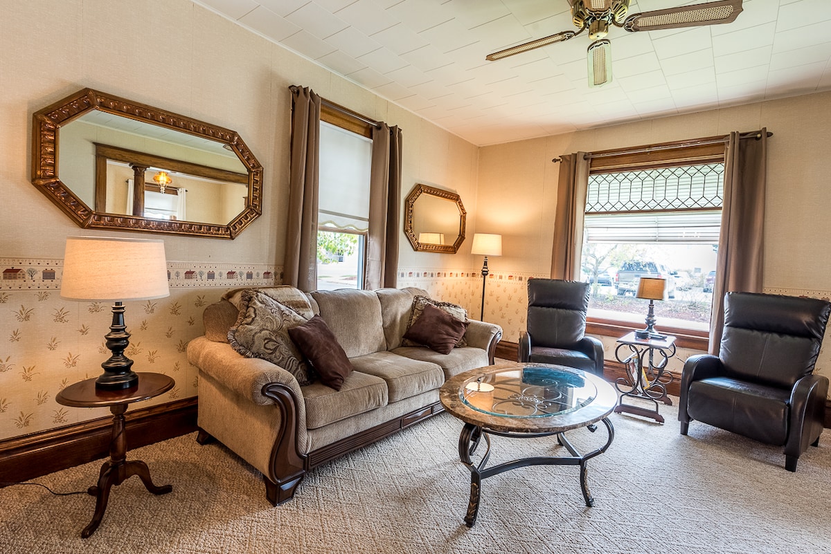 This garden-level apartment offers a comfortable retreat with a full kitchen, dining nook, living area with fireplace and projector screen, with 2 bedrooms with a shared bath. Step outside to your dedicated lakeview patio, with Fountain Lake directly across the street. Laundry is available within the apartment. Guests are also welcome to join Amy upstairs in the morning for French press coffee or tea and a homemade baked good before heading out. Downtown is only a few blocks away.