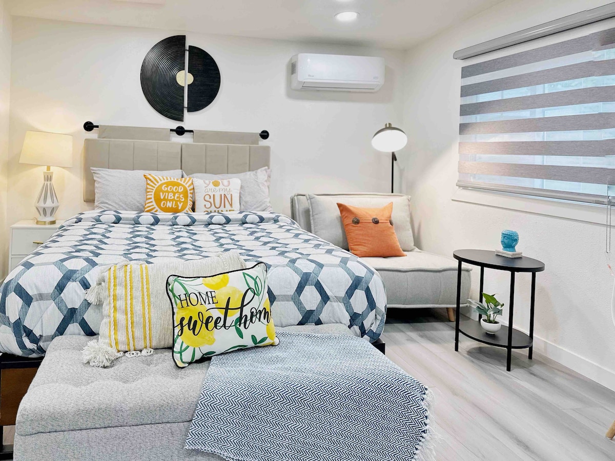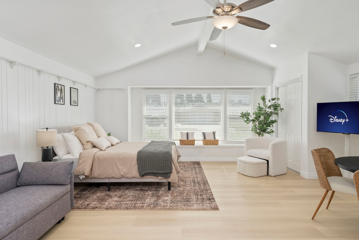 Sveiki atvykę į mūsų mažą namelį! Su privačiu šoniniu įėjimu, erdvėje yra atvira svetainė ir miegamoji zona su karališko dydžio lova. Virtuvėje yra granitiniai stalviršiai, mikrobangų krosnelė ir dviejų degiklių viryklė. Jis nėra didelis, bet švarus, o vieta puiki – pėsčiomis galima pasiekti Claremont Village ir 5 Claremont koledžus. Mūsų namuose laukiami visi žmonės. Klermontas trumpalaikės nuomos leidimo numeris: STR-005