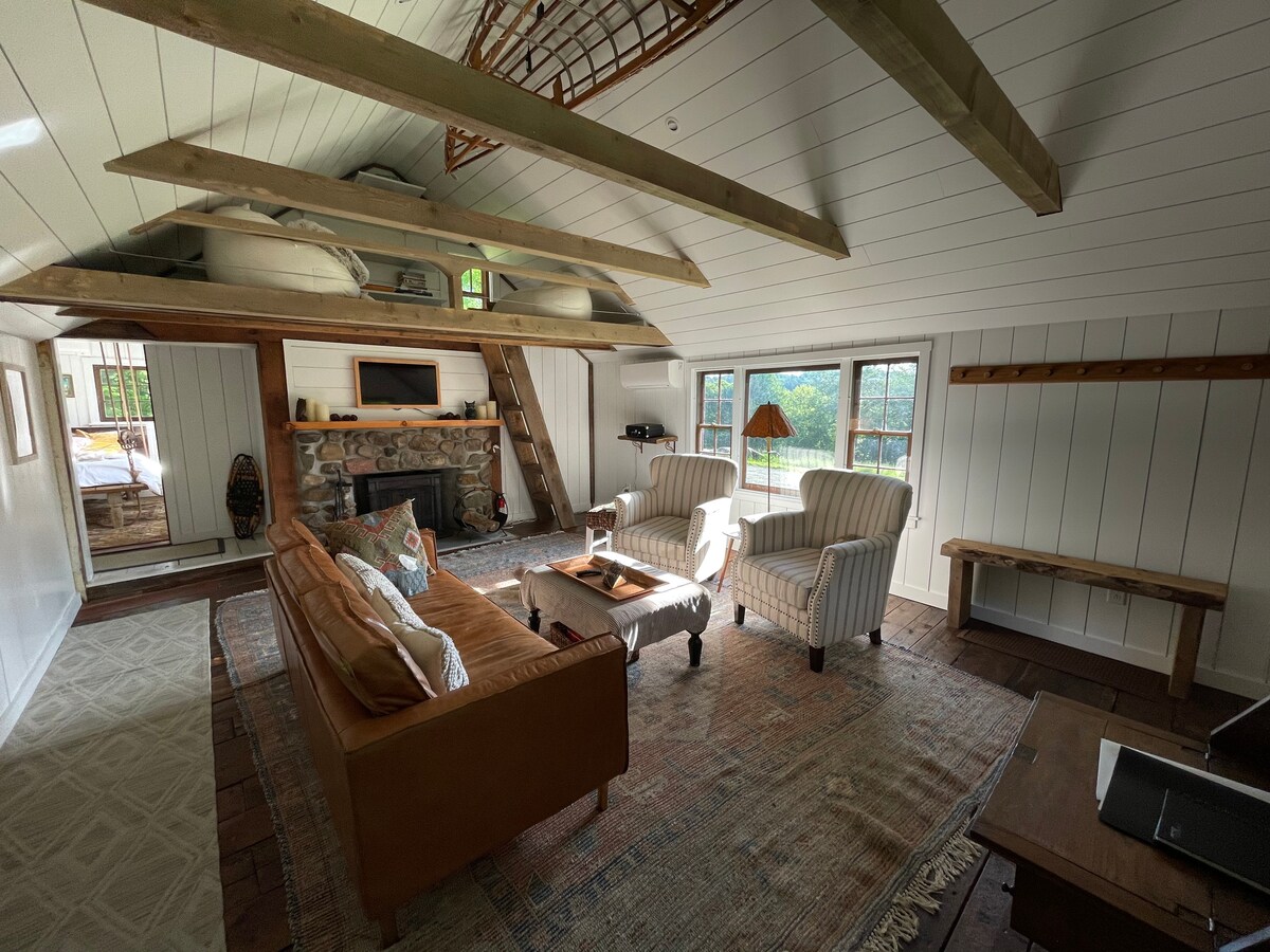 Romantiška moderni trobelė su privačia sūkurine vonia 40 hektarų Vermonto ūkyje. Šiame skandinaviško stiliaus būste yra aukšti langai, didelė dvigulė lova su prabangia patalyne, jaukus židinys ir elegantiška virtuvė. Puikiai tinka poroms, ieškančioms ramaus poilsio, viešnagės ūkyje ar ekologiško poilsio. Mėgaukitės žvaigždėtu dangumi, susipažinkite su mūsų draugiškomis ožkomis ir grožėkitės pietų Vermonto grožiu iš savo saulės energija maitinamos, šviesios trobelės.