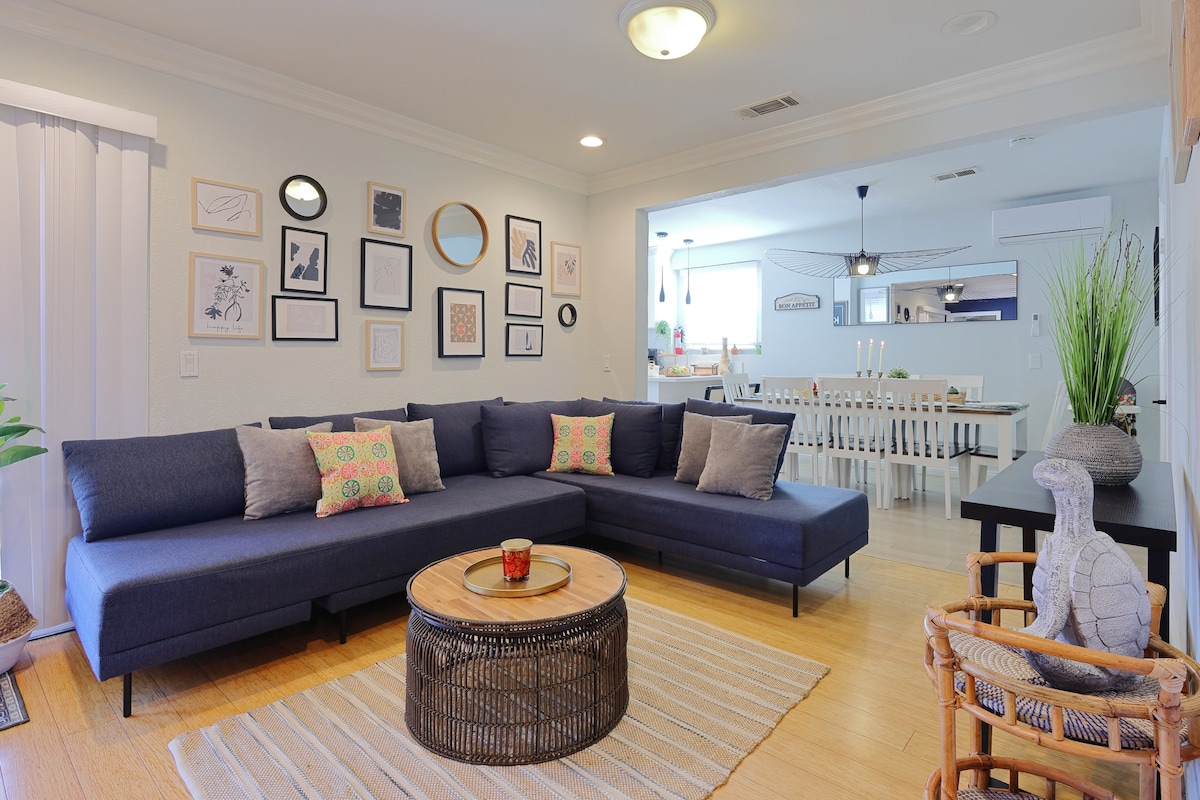 Meno kupina poilsio vieta su unikaliais eksponatais, vešliu sodu su ryškiais augalais ir augmenija, nedideliu tvenkiniu, privačiu baseinu ir SPA zona, laužaviete ir lauko virtuve. Atsipalaiduokite ramioje akligatvio gatvėje esančiame būste su dviem pavėsingais vidiniais kiemais, moderniomis pramogomis, įskaitant televizorius su transliacijomis internetu, erdvinio garso sistema, mažu biliardo stalu ir „Xbox“ konsole. Puikiai tinka šeimoms, draugams, poroms ar verslo keliautojams, ieškantiems komforto, privatumo ir įsimintinos viešnagės Pietų Kalifornijoje netoli Disneilendo ir pagrindinių lankytinų vietų.