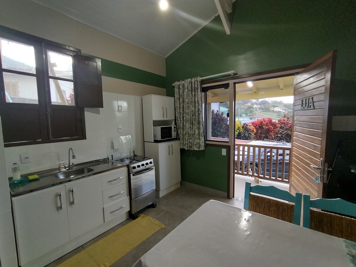 Studijos tipo mansarda su gražiu vaizdu ir paukščių garsu! Privati 60 m ir 30 metrų vidinė lauko dalis. Pilnai įrengta virtuvė, lovos ir vonios patalynė; išmanusis 43colių televizorius, elektroninė spyna. Rami, rami ir jauki vieta! Iš dalies vaizdas į Campeche salą ir Morro das Pedras paplūdimį, kaimą ir kalnus. Platus lauko plotas su sintetine žole, sūkurinė vonia su hidromasažu (šaltas), hamakas, kepsninė, stalas. Saulėtos dienos (šiaurinis veidas) ir nepamirštamas saulėlydis.