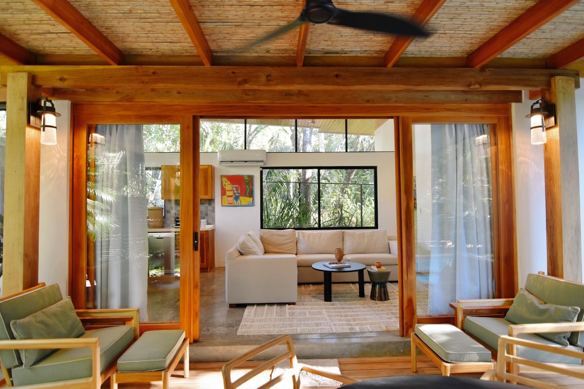 Thoughtfully designed, this elevated and high ceiling house offer all the comfort and convenience needed for both short and extended stays. - Loft bedroom with queen-size bed - Living room, sofa bed (medium) - Spacious and sunlit - Desk - Bathroom w/ rain shower - AC, ceiling fans - 100mb Wi-Fi - Safe box - Fully equipped kitchen (stove, fridge, microwave, coffee maker, more. - Covered terrace - Large sliding glass doors (w/ screens) - Laundry - Pool - Outdoor shower - Private & secure parking