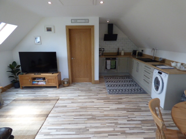 Self contained annexe with minimal cooking facilities - downstairs open plan kitchenette with microwave and hob, lounge area (smart TV), dining area. Upstairs in master bedroom king size bed, (smart TV) sloping attic roof - separate shower room with toilet and wash handbasin. Second bedroom (request booking please) single bed, sloping roof. Outside toilet and fridge if required. Welcome pack for your first breakfast. Kitchen facilities suitable for breakfast and light lunches.