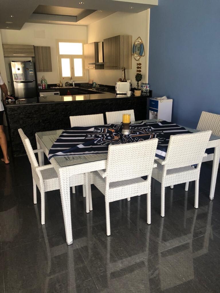 Atsipalaiduokite šioje ramioje, stilingoje erdvėje. Prabangi vila prestižiškiausioje vietovėje su gražiausiu sodu Marina Gate 7 , su privačiu baseinu, visiškai renovuota, penkių žvaigždučių įranga, įrengta, su oro kondicionieriumi, su visais patogumais ir kurioje gali apsistoti iki 10 žmonių, po El Alamein bokštais ir antroje eilėje nuo paplūdimio Labai arti Boboss jachtų prieplaukos, Nemokamas Wi-Fi Atsipalaiduokite su visa šeima šiame ramiame būste.