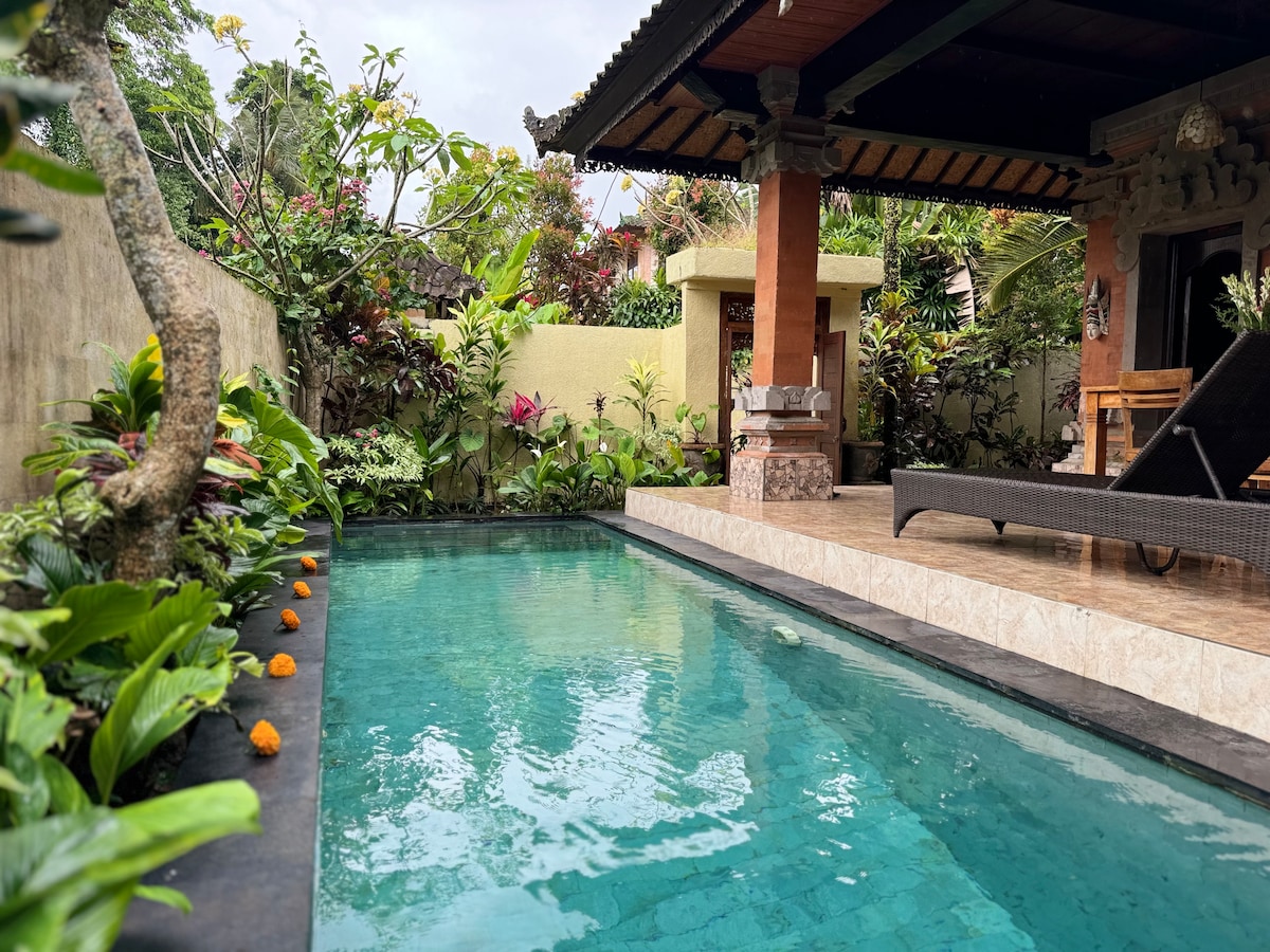 Romantiškas poilsis gamtoje ramioje Tegallalang! 1 miegamojo vila su privačiu baseinu, virtuve ir laužaviete. Pusiau lauko vonios kambarys apima mūsų unikalią gamtos koncepciją tarp ryžių laukų. Puikiai tinka poroms, ieškančioms autentiško Balio kaimo gyvenimo su modernia prabanga. Įskaičiuoti pusryčiai 2 asmenims. Mėgaukitės stebuklingais saulėlydžiais, žvaigždėtais vakarais prie ugnies ir gaivinančiais privataus baseino krituliais, apsuptais vešlios žalumos. Jūsų laukia tobulas pabėgimas!“