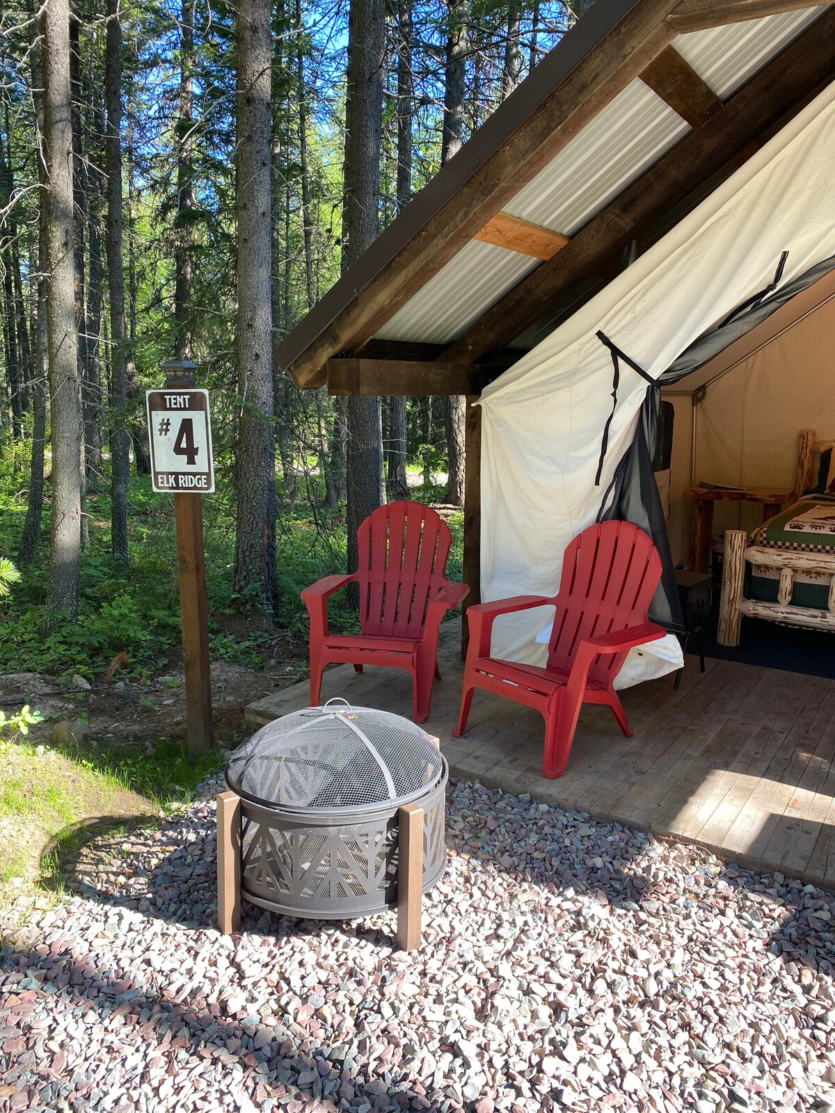 7 mylios nuo vakarinio įėjimo į ledyno nacionalinį parką - puikiai tinka poroms, kurios planuoja praleisti didžiąją laiko dalį ledyne. 12 x 14 sieninė palapinė su malkomis kūrenama krosnele šaltoms naktims! 1,5 akro. Privatus įėjimas, viskas aptverta. Yra saulės kolektorius, kuriame galima prijungti būtiniausius reikmenis, ir stovyklos viryklė bei ugnies žiedas maisto ruošimui. Suteikiame vėsintuvą ir vandenį. Yra namelis su propano šildomu dušu. Neskirta lengviems pabėgiams. Traukinys atvyksta porą kartų per naktį.