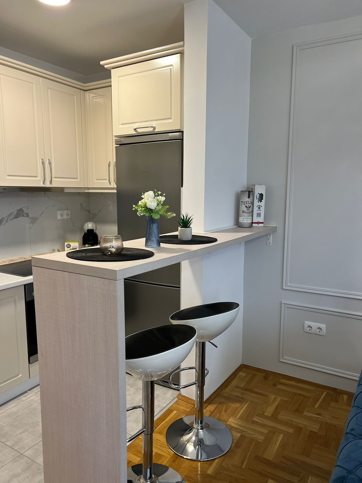 Mėgaukitės komfortu ir stiliumi visiškai naujame, prabangiai įrengtame bute, idealiai tinkančiame trumpalaikei viešnagei, romantiškam savaitgaliui, verslo kelionei ar poilsiui mieste! Apie butą: Patogi svetainė su išmaniuoju televizoriumi Dvigulė lova Pilnai įrengta virtuvė Elegantiška vonia Nemokamas Wi-Fi, oro kondicionierius, šildymas NEMOKAMAS GARAŽAS Vieta: Butas yra patrauklioje miesto dalyje – ramioje gatvėje, vos už kelių minučių kelio pėsčiomis nuo centro, restoranų, kavinių ir prekybos centro. Puikus susisiekimas su visomis miesto dalimis.