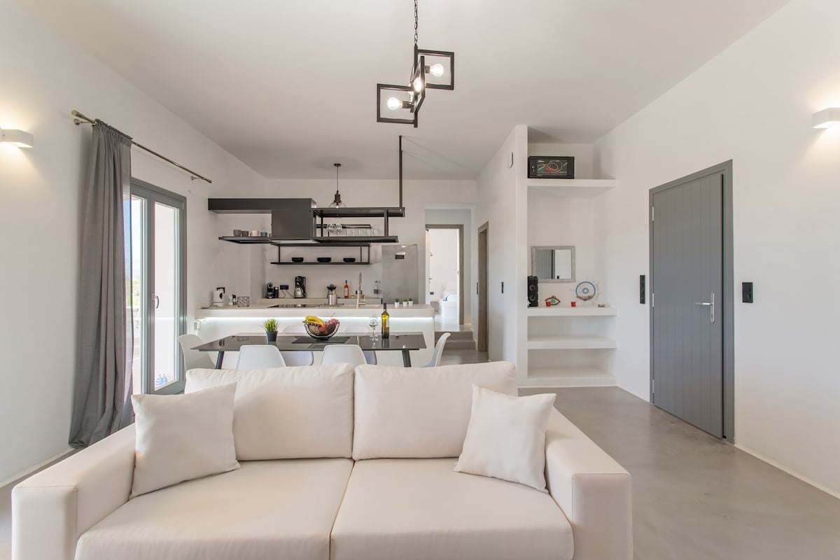 Atidarykite mėlynas langines ir įleiskite vėsų vėją, tada užkąskite prie miesto betono virtuvės stalviršio vėjuotoje poilsiavietėje prie kranto. Užlipkite į erdvią, lapuotą verandą ir mėgaukitės laisvalaikio saulėlydžio gėrimais su netrukdomu vaizdu į vandenyną! Butas yra šalia smėlio paplūdimio rytiniam maudynėms ir 2 minučių pėsčiomis nuo Naousa centro ir jo pagrindinės aikštės. Parduotuvės, restoranai, barai ir klubai yra netoli pėsčiomis, tačiau vietovė labai rami!