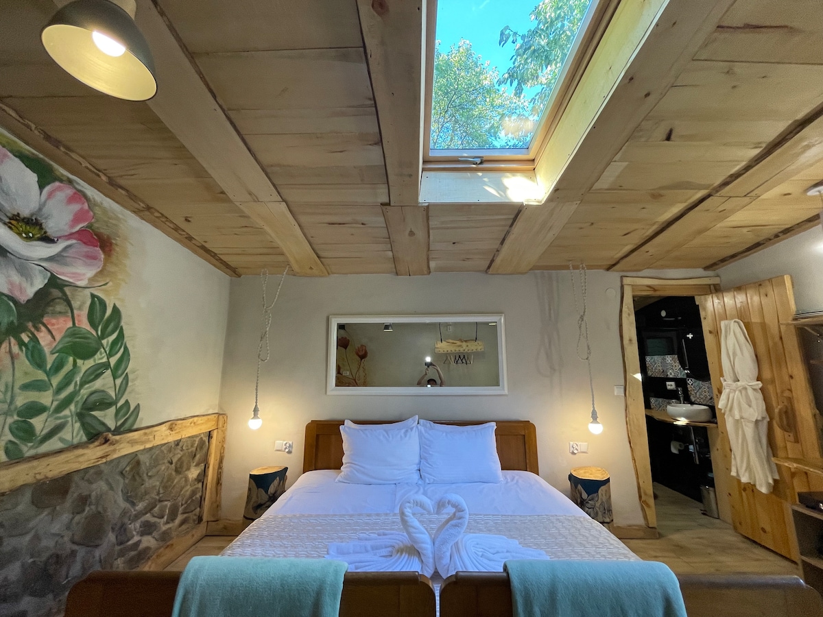 Sveiki atvykę į „Gėlių“ kambarį „Agritourism Wakop 6“ – tai puiki vieta romantiškai išvykai pačioje Świętokrzyskie kalnų širdyje! Mėgaukitės unikalia šio jaukaus interjero atmosfera, kai medinės lentos ant lubų ir langas, pro kurį galite grožėtis žvaigždėmis, sukuria unikalią atmosferą. Malkomis kūrenamo židinio šiluma suteiks jūsų vakarams žavesio. Nedidelis ir jaukus vonios kambarys suteiks visišką komfortą. Praleiskite nepamirštamas akimirkas netoli gamtos ir užsisakykite jau šiandien!
