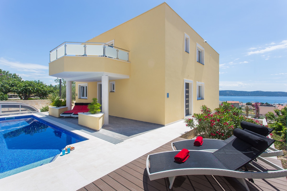 Ši stilinga nauja moderni vila puikiai tinka puikioms atostogoms saulėtoje Dalmatijos pakrantėje. Viloje yra erdvi svetainė su moderniu židiniu, valgomasis ir pilnai įrengta virtuvė, vidaus sporto salė, keturi erdvūs miegamieji su šiuolaikišku moderniu dizainu ir atitinkamu vonios kambariu. Būste yra šildomas baseinas su hidromasažu. Yra poilsio zona su saulės lovomis, kavos staliuku, sėdimų vietų išdėstymu ir lauko kepsnine.