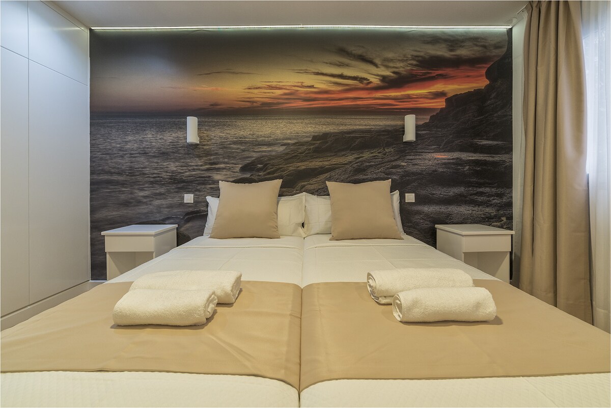 Šviesus mansardinis butas su privačia terasa ir vaizdu į kalnus. Jame yra du atskiri miegamieji, patogi svetainės zona ir pilnai įrengta virtuvė. Puikiai tinka šeimoms arba ramiai viešnagei Las Palmaso mieste. Kasdienio valymo paslauga su švariais rankšluosčiais ir visą parą dirbanti registratūra, kuri gali padėti bet kuriuo metu. Mėgaukitės viešbučio komfortu ir buto erdve bei laisve, įskaitant Wi-Fi ir oro kondicionierių.