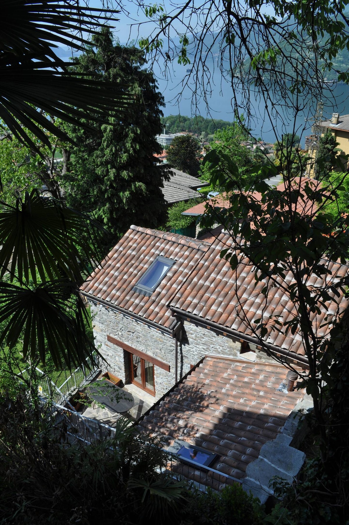 The Cottage is an old farmhouse recently renovated and located in the large garden of the main building where our family lives. It is a 40 m2 suite on two levels. On ground floor there is a living room with kitchenette, a single sofa bed, the bathroom and the porch at garden level. Upstairs is located the loft bedroom with lake view.