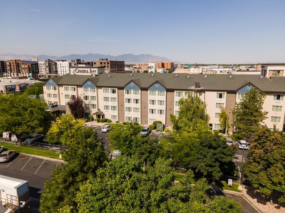 Viešnagės metu mėgausitės 1 dvigule lova ir 2 dvigulėmis lovomis! Ateikite į Temple VIew Inn, įsikūrusį pačioje Ogdeno širdyje. Komfortas ir patogumas: ženkite į mūsų apgalvotai suprojektuotą kambarį, kuriame komfortas atitinka patogumą. Ogdenas turi viską! Su slidinėjimo kurortais, istorine 25-ąja gatve, teatrais, apsipirkimu ir Pineview rezervuaru! Slidinėjimo kurorto autobusas vos už kelių kvartalų! Patogi nemokama automobilių stovėjimo aikštelė!