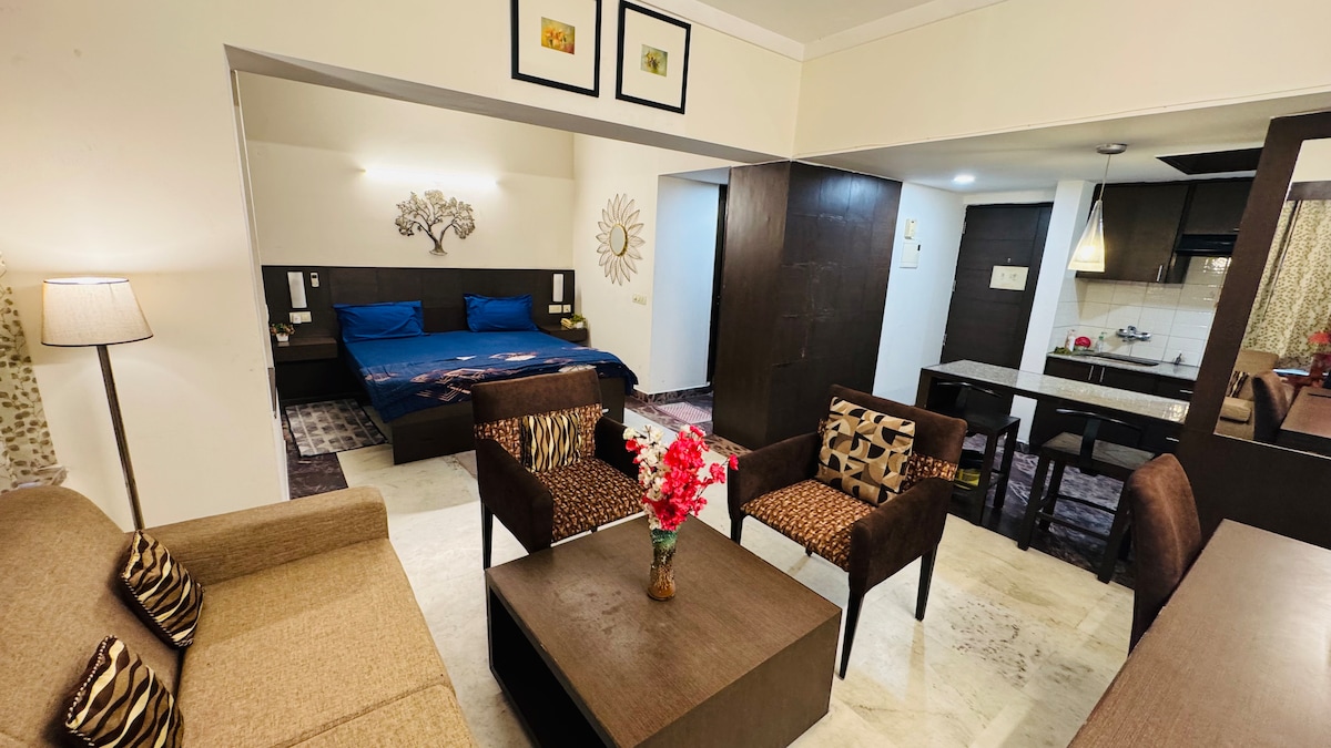 Kick back & relax in this calm & luxurious studio with the warmth of home & the vibe of a high-end hotel. Furnished with a plush Queen-size bed & modern décor. Amenities: 24/7 Grocery Store Modern Kitchenette High-Speed WiFi & TV Secure Parking outside tower but 24/7 Secured The first 2 floors has commercial shops, offering: Laundry Services Salon Café Medical Store Easy access to the India Expo Mart, Buddh International Circuit. Perfect for couples, solo travellers, or business partners.
