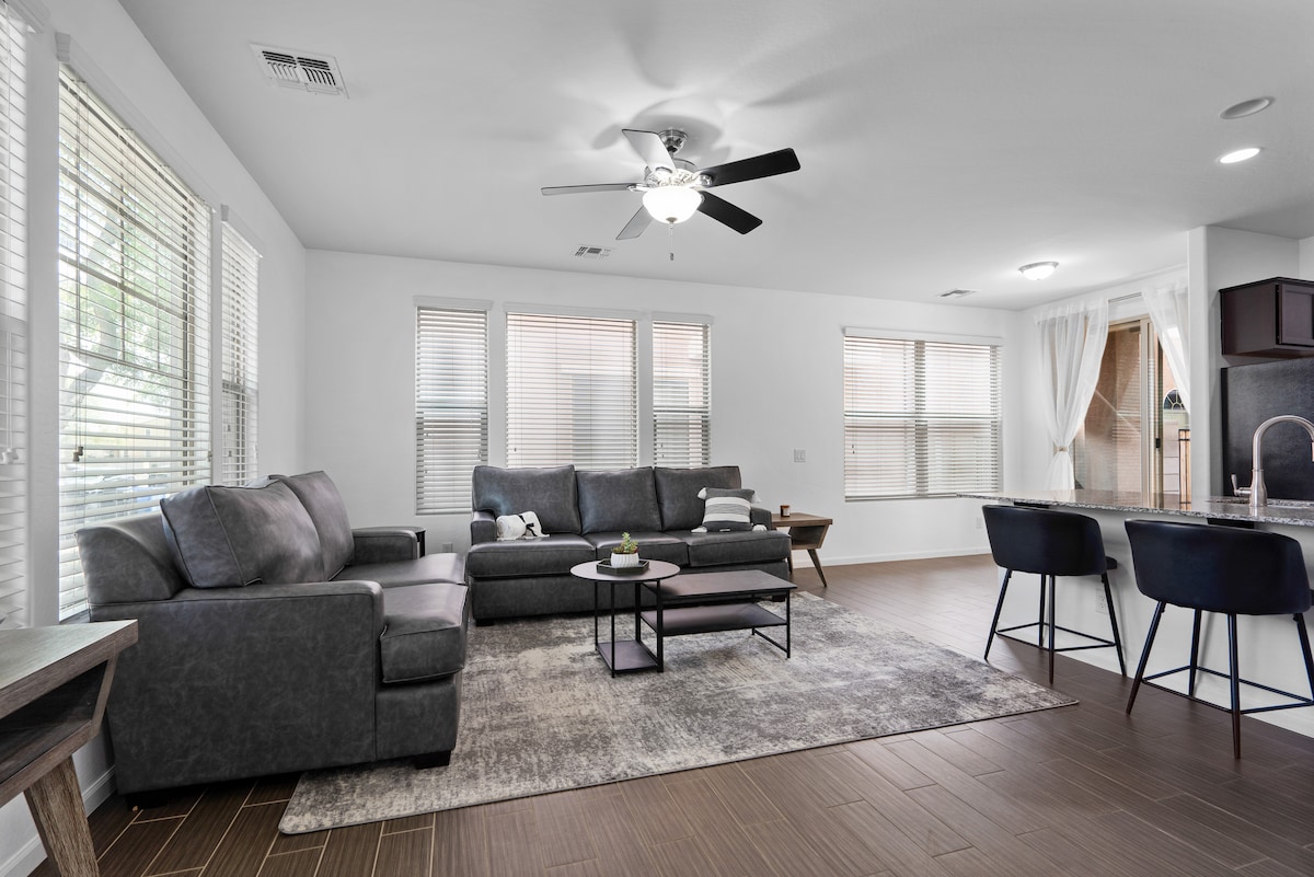 Beautiful new home in Gilbert, family friendly and spacious! The perfect family & friends vacation home. * 3 bedrooms with King and Queen size beds. * 2 renovated bathrooms. * Bright full size kitchen with cookware. * Spacious living room with lots of natural lighting. * Large turf backyard * Garage and driveway parking available. * Peaceful, family friendly neighborhood. * Near downtown Gilbert and large Freestone Park