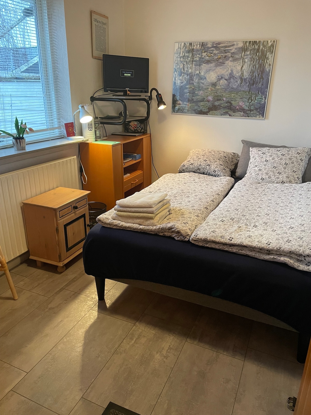 Jūs turėsite atskirą įėjimą į butą. Iš miegamojo įėjimas į televizoriaus kambarį / virtuvėlę su galimybe miegoti 2 asmenims ant sofos-lovos. Iš televizoriaus kambario yra įėjimas į atskirą vonios kambarį / tualetą. Bus galima laikyti daiktus šaldytuve su maža šaldykle. Yra elektrinis virdulys, kad galėtumėte pasidaryti kavos ir arbatos. Virtuvėlėje yra 1 mobilioji viryklė ir 2 maži puodai bei 1 orkaitė Kambaryje negalima kepti. Šaltus gėrimus galima įsigyti už 5 DKK, o vyną - už 35 DKK. Mokama grynaisiais arba MobilePay.