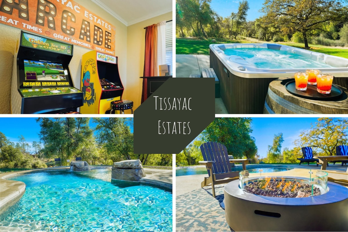 Mūsų jaukūs namai yra puikus pabėgimas ieškantiems ramaus poilsio kalnuose su lengva prieiga prie Josemičio parko, vos už 20 minučių kelio automobiliu. Pats namas yra komforto uostas, kuriame yra 4 miegamieji, 5 vonios kambariai, žaidimų kambarys, 2 baseino stalai, stalo teniso stalas ir dar daugiau. Nesvarbu, ar ieškote romantiškos kelionės, šeimos nuotykių ar draugų susibūrimo, mūsų nuosavybė turi ką pasiūlyti visiems. Mūsų erdvūs 3700 kv. pėdų 3 akrai. Mėgaukitės erdviu kiemu su prieiga prie savo upės.