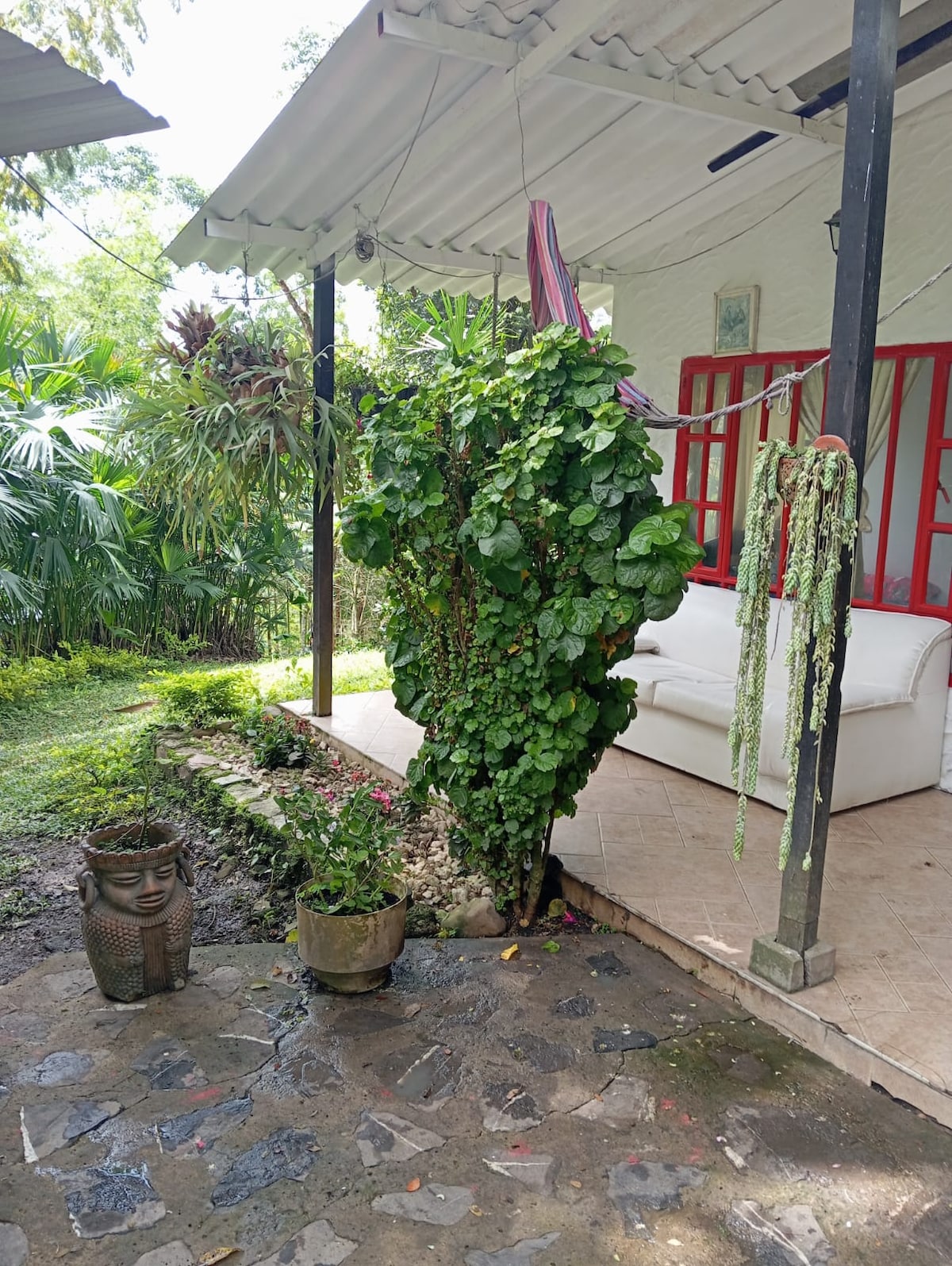 Atmosfera ir dekoracijos yra labai šalies. Yra vieta kepti ant grotelių. Yra ežeras, atskirtas nuo gyvenamosios erdvės, su žuvimis ir viščiukais, į kuriuos galite maitinti. Yra hamako zona. Visa erdvė skirta atsijungti, pailsėti ir mėgautis kaimo gyvenimu be rūpesčių. Nors svetainėje taip pat yra televizorius su tiesiogine televizija. Kaina nurodyta už visą namą.