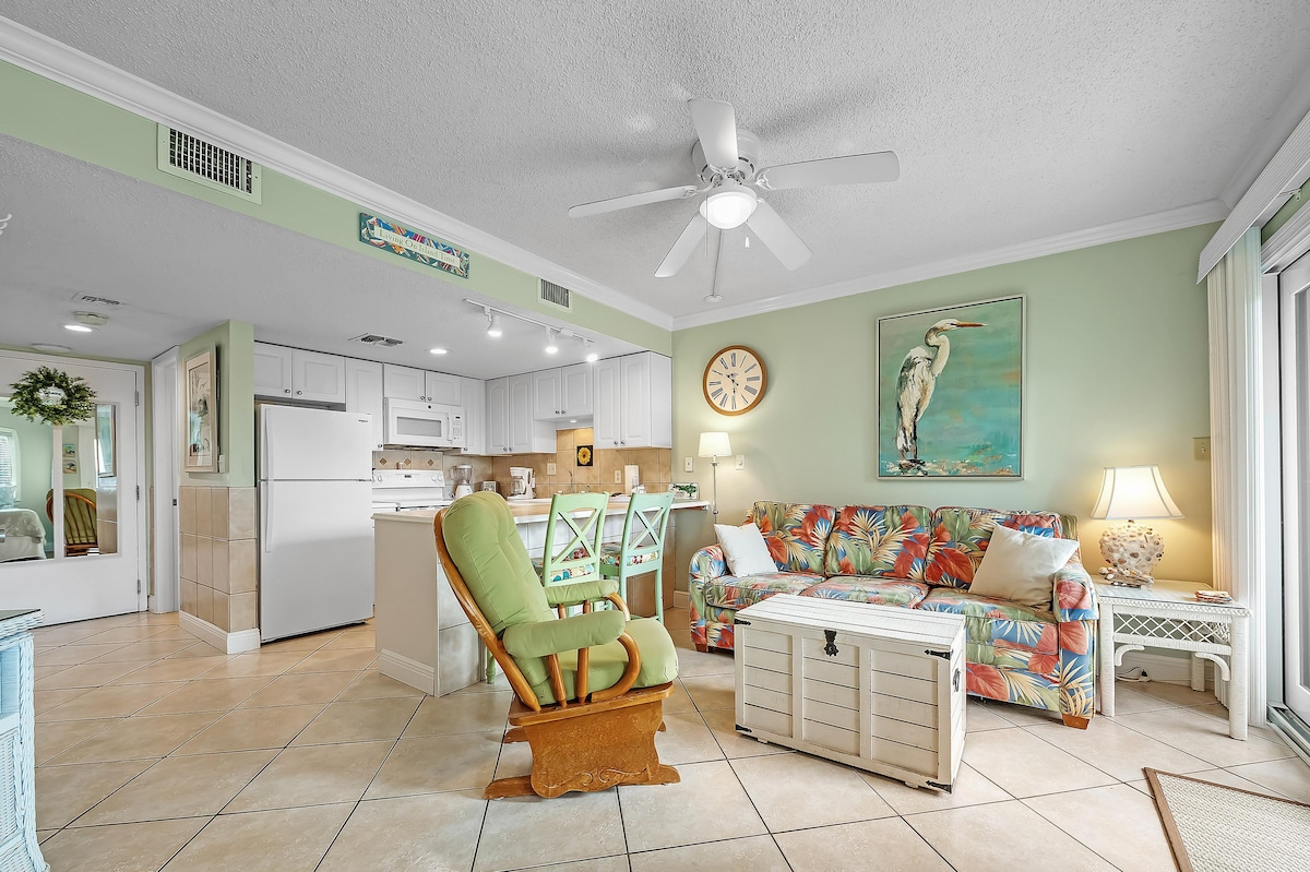 Mėgaukitės viešnage paplūdimyje su mumis! Mūsų kondominiume yra dvigulė lova pagrindinėje, ploni gultai salėje, puikiai tinkantys mažiems vaikams, ir dvigulė sofa-miegamoji svetainėje. Jūsų rytinė kava geriau skonis balkone su vaizdu į paplūdimį. Virtuvėje yra indaplovė, viryklė, įprastas 12 puodelių kavos puodelis, keli puodai ir keptuvės bei mikrobangų krosnelė. Kurorte yra daug patogumų, įskaitant du lauko baseinus, vidaus baseiną ir sūkurinę vonią, treniruoklių salę ir krepšinio bei teniso kortus.