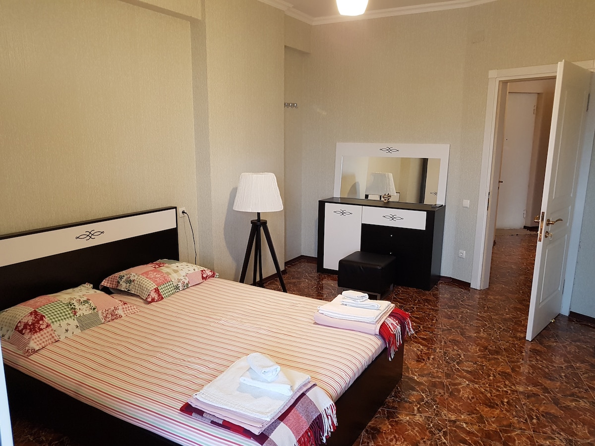 Butas yra autobusų stoties teritorijoje, aplink yra prekybos centras, vaistinė, ligoninė, vaikų parkas, žaidimų aikštelė, bažnyčia... Butas turi savo didelį kiemą. Bute yra visa reikalinga įranga ir prietaisai, įskaitant: skalbimo mašiną, indaplovę, 2 oro kondicionierius, šaldytuvą, centrinį šildymą, 2 televizorius ir kt. Buto plotas – 105 kv. m. Bute gali apsistoti 5+2 asmenys.