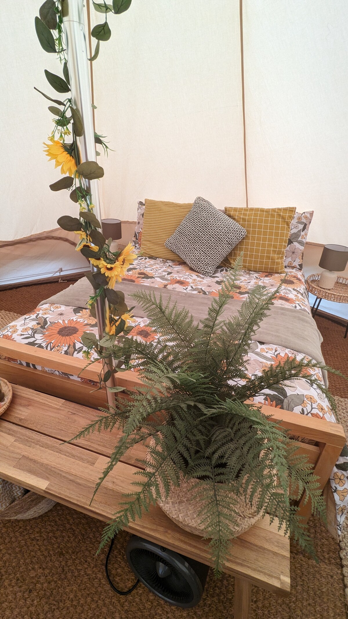 Skambučių palapinės glempingas gražioje, ramioje vietoje. Puikiai tinka dviem suaugusiems arba ne daugiau kaip dviem suaugusiems ir dviem vaikams Netoliese yra visa vietovė, kur geriau praleisti atostogas glempinge. Yra dušo/tualeto ir virtuvės zona (bendras šaldytuvas-šaldiklis, virdulys, mikrobangų krosnelė, oro gruzdintuvas), bendra su mūsų maža namelių-autopriekabų vieta. Abiejose palapinėse yra patalynė, po lova, kempingo kėdės, indai, puodai/keptuvės, indai, rąstai, chimenea, žiebtuvėliai, elektrinė antklodė, elektrinis šildytuvas/ventiliatorius.
