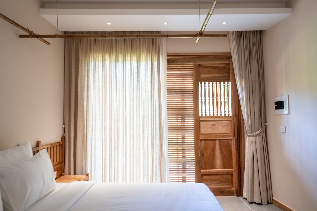 Phòng 2 giường đơn (Twin) cỡ lớn nằm trên Tầng 2, view ra Vườn Quê với hệ cây sinh dược, gia vị và cây ăn trái theo mùa, mỗi mùa là 1 cảnh sắc và mùi hương hoa riêng, nội thất tối giản gỗ tự nhiên, có điều hòa, phòng tắm có bồn tắm, đèn sưởi.