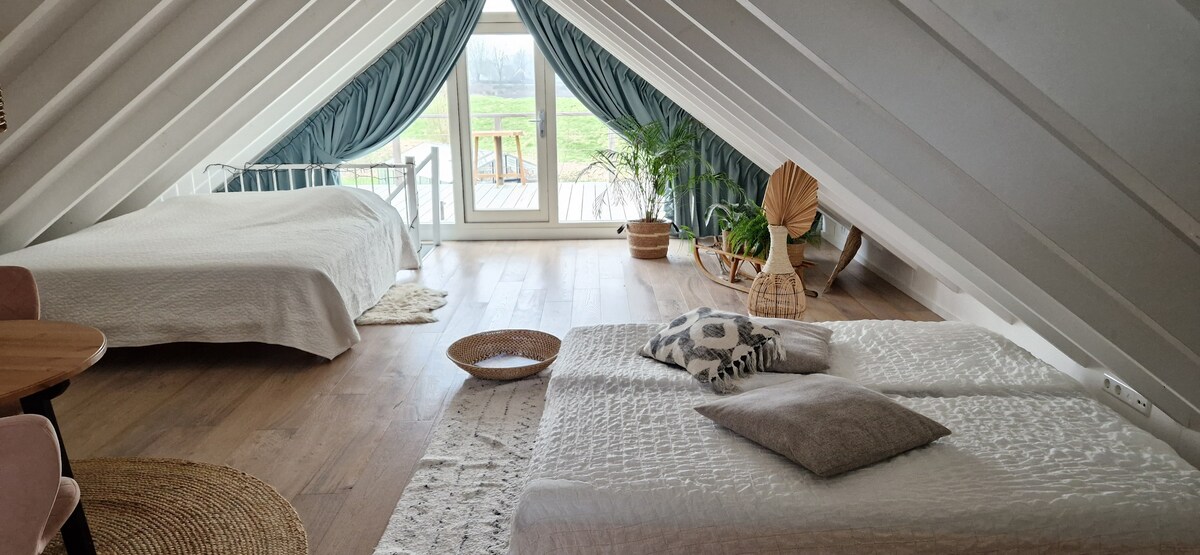Gražus jaukus loftas su privačiu įėjimu ir prabangiu vonios kambariu. Loftas turi privačią terasą, iš kurios atsiveria gražus vaizdas į „Stelling van Amsterdam“, istorinę UNESCO paveldo vandens apsaugos liniją. Atstumas pėsčiomis nuo banglenčių sporto ir daug vandens sporto užsiėmimų. Pusryčiai neįskaičiuoti, jie yra pagal poreikį. Išlaidos yra 12,50 euro pp, vaikai 7,50 EUR. Hoofddorp ir jo oro linijų mokymo centras CAE yra už 15 minučių kelio automobiliu. Schiphol 10min Hoofddorp 10min Amsterdamo centras 20 min.