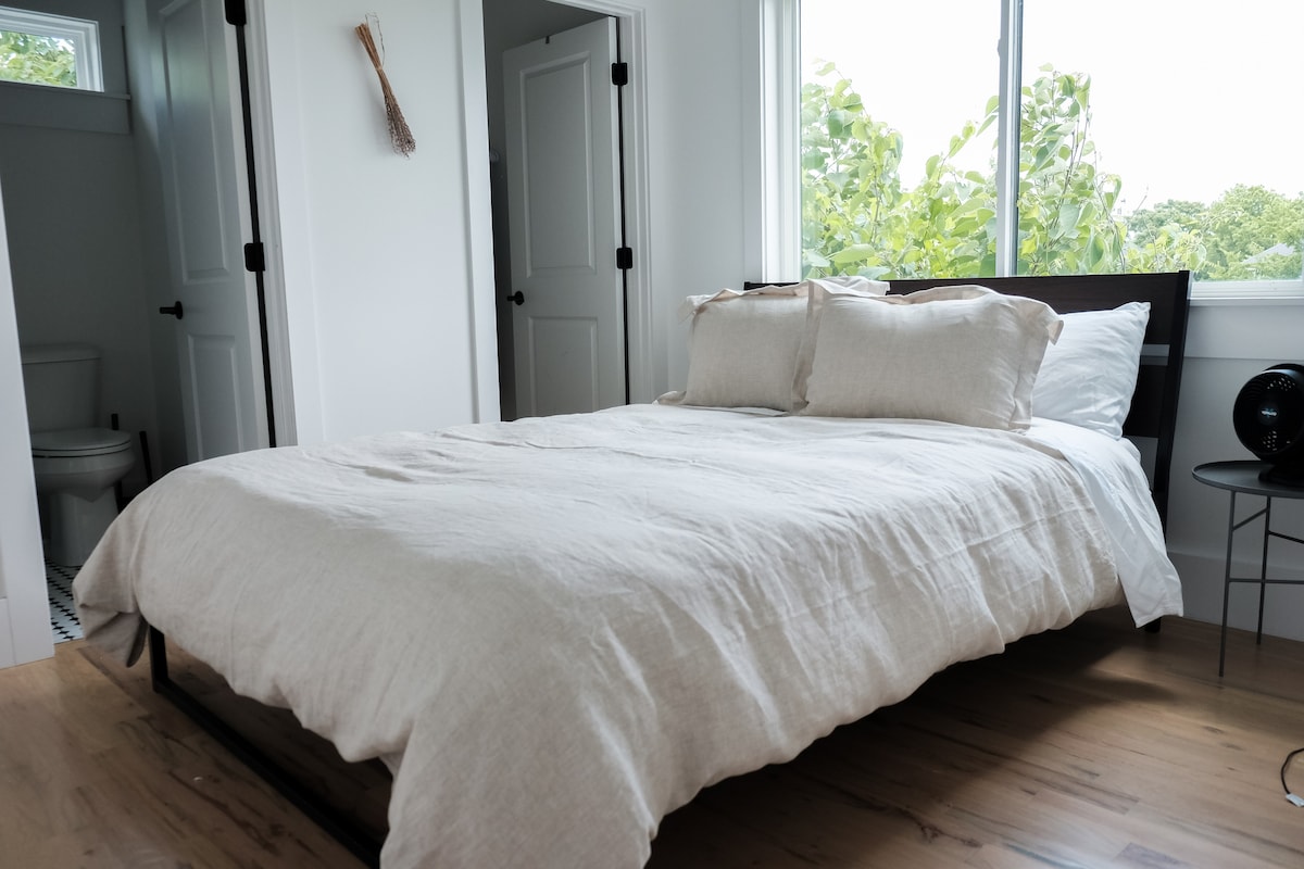 Pabėkite į naują erdvę! Jus pasitiks raudono ąžuolo grindys ir minimalus, bet jaukus dekoras. Šis viršutiniame aukšte esantis butas yra ramioje rajono alėjoje, kurioje galima vaikščioti pėsčiomis. Nors tarp bambukinių paklodžių, ekologiškų dušo reikmenų, COOP pagalvių ir 75 colių televizoriaus „The Frame“ galbūt ir neišeisite! Žaliuzės ir PDLC plėvelė ant kiekvieno lango užtikrina privatumą, o dideli langai suteikia šviesos ir gryno oro. Ir nenuvertinkite išmaniojo tualeto/bidė! Privati automobilių stovėjimo aikštelė dviem transporto priemonėms. @southside17loft