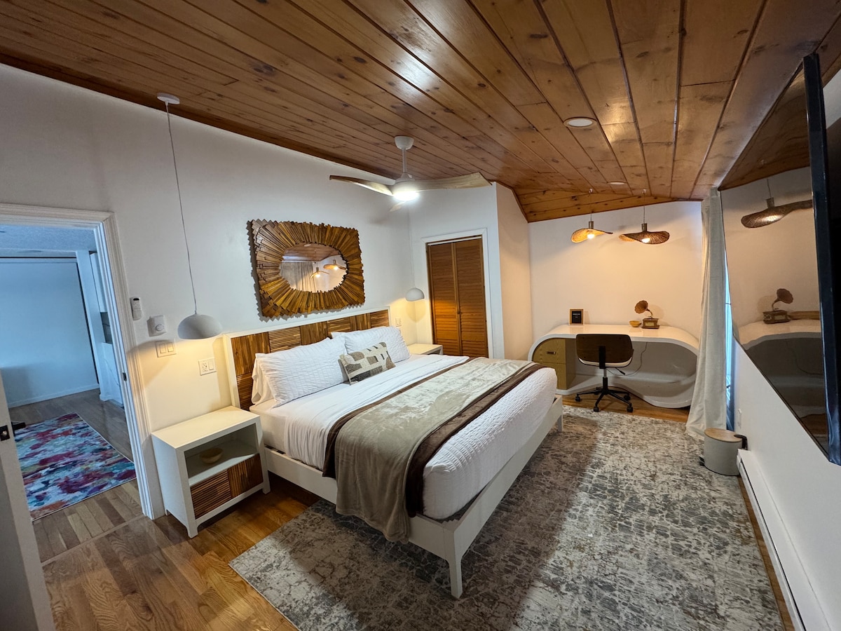 DABAR SU SŪKURINE VONIA! Visiškai privatūs pagrindinio miegamojo apartamentai ramiame rajone netoli visko Nortamptone! Jūsų veranda su kavinės stalu ir kėdėmis veda į privatų įėjimą į apartamentus. Erdviame ir šviesiame miegamajame yra didžiulis vonios kambarys su dušu, biuras/ virtuvėlė/ valgymo zona ir spinta su pilnai aprūpintais skalbiniais. Karališkoje lovoje yra vietoje pagamintas, vidutinio tvirtumo čiužinys ir gausi patalynė. Televizorių Roku prijungia prie visų pagrindinių transliavimo paslaugų.