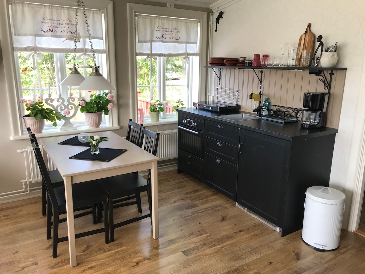 Kotedžas didesnio namo kieme. Kotedžas yra visiškai atnaujintas. Tik nuomai. Privati terasa ir automobilių stovėjimo aikštelė. Elektrinio automobilio įkroviklis. Pasiimkite savo laidą. Visa sodyba yra visiškai neprivažiama kelio pabaigoje gražiame slėnio kaime Djura. 3 km iki gražaus ežero. 15 km iki Leksand su daugybe slidinėjimo trasų ir čiuožyklų ant Siljan. 30 km iki Granberget slidinėjimo kurorto. Didelis lankytinų vietų ir turistų traukos vietų pasirinkimas rajone. 7 min. kelio automobiliu iki stoties ir 3 min. pėsčiomis iki autobuso.
