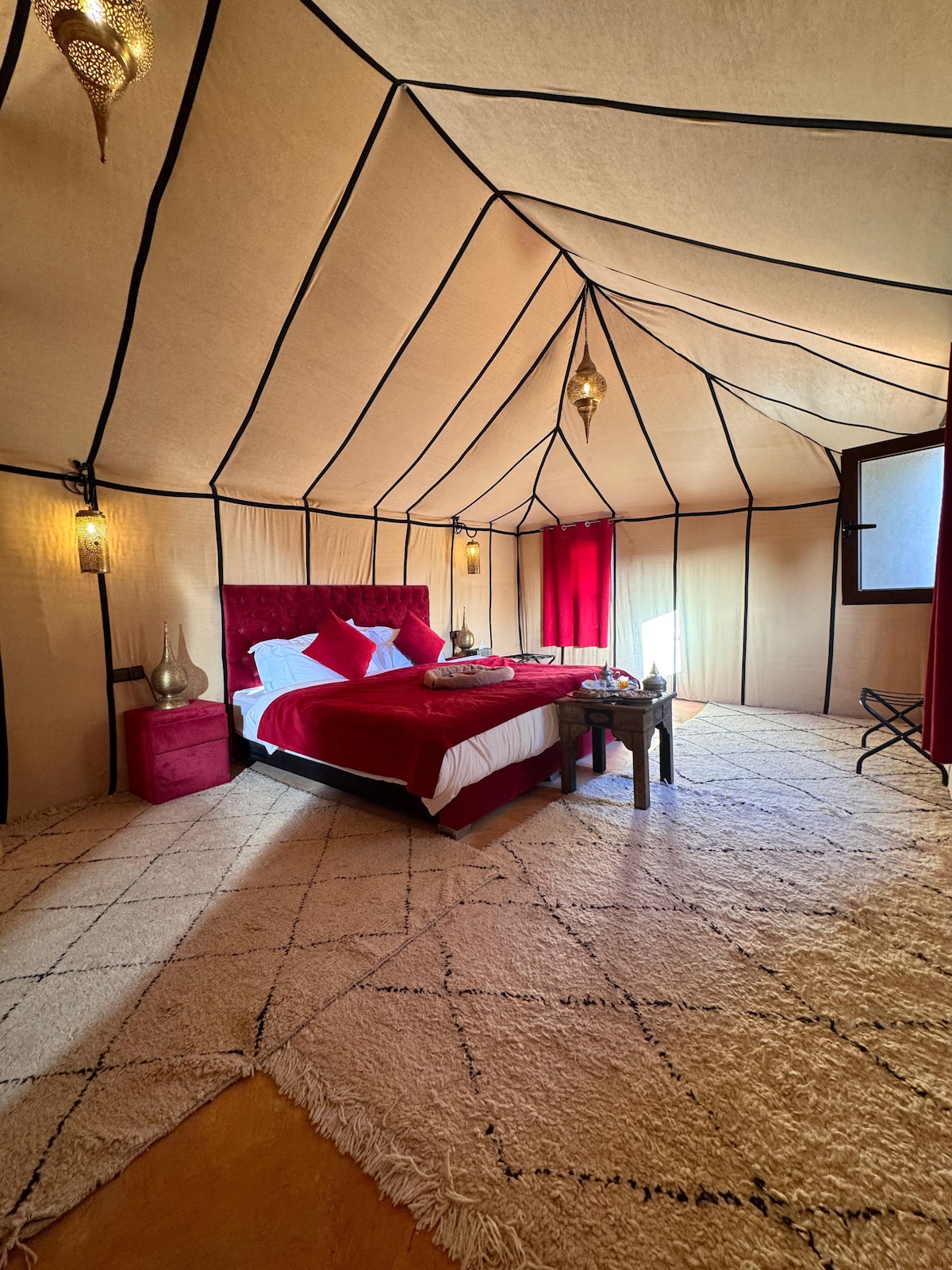 Mūsų prabangioje stovykloje galite pasinerti į dykumos grožį mėgaudamiesi jodinėjimu kupranugariais kopomis ir stebėdami saulėlydį virš Erg Chebbi kopų. Kiekvienoje palapinėje yra patogi lova, privatus vonios kambarys ir dušas. Po skanios vakarienės stovykloje galėsite atsipalaiduoti po žvaigždėtu dangumi ir mėgautis berberų muzika prie laužo. Nepraleiskite galimybės pamatyti nuostabų saulėtekį stovykloje.