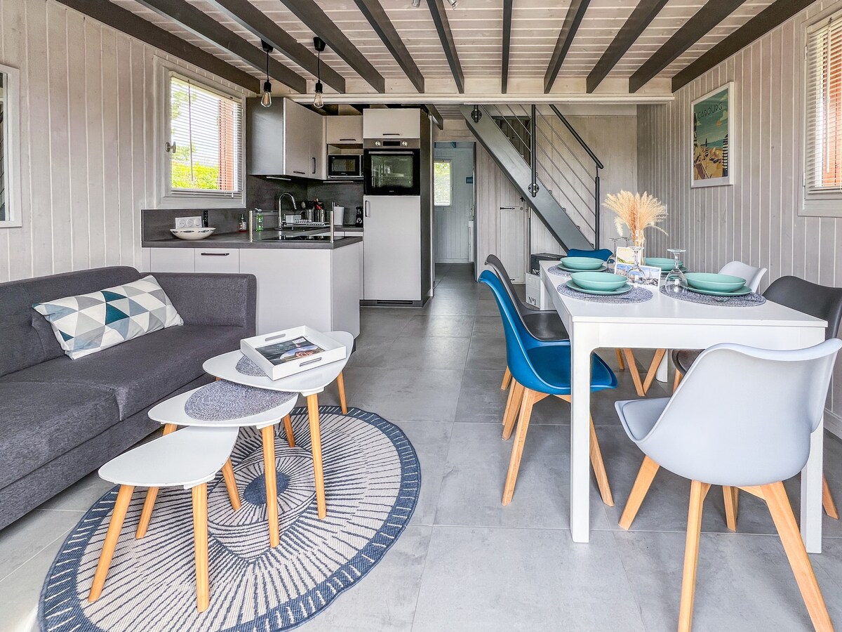 Gyvenamajame parke, apsuptame žalumos, CORINNE siūlo nedidelį poilsio namelį, kuriame telpa 4 žmonės, įskaitant svetainę, svetainę, su sofa-lova (140 ), televizorių , 1 miegamąjį su lova (140 ), mezoniną su 2 viengulėmis lovomis, lovelę, 1 mažą virtuvę su indukcine virykle, mikrobangų krosnelę, elektrinę orkaitę, dušo kambarį, skalbimo mašiną, uždarą žemę 200 m2 su kepsnine ,hamaką, sporto salę. Parke yra privati automobilių stovėjimo aikštelė