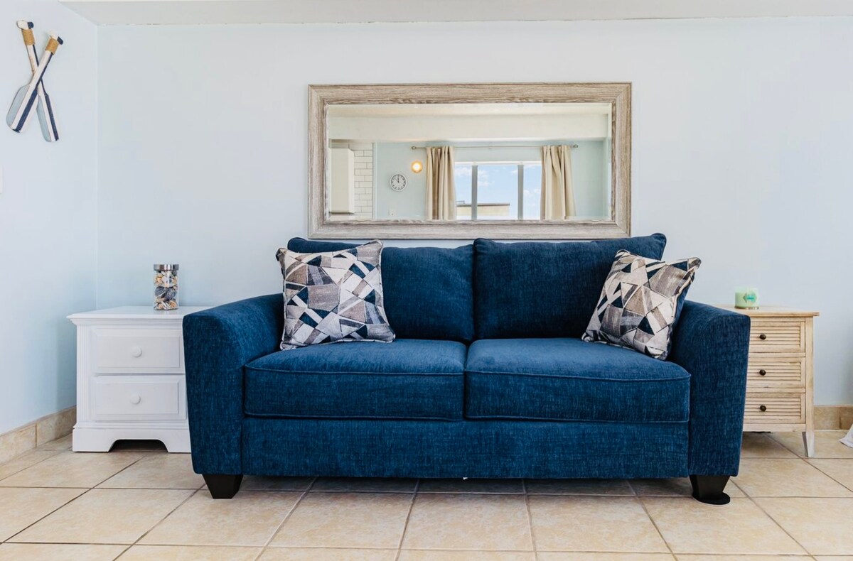 Tiesioginis pilno dydžio vieno miegamojo kondominiumas prie vandenyno paplūdimio kolonijos kurorte. Pabuskite ir pamatykite nuostabų vaizdą į vandenyną vos už kelių žingsnių nuo paplūdimio. Balkone turime dvi labai patogias baro aukščio kėdes, iš kurių atsiveria netrukdomas vaizdas į vandenyną ir paplūdimį! Pagrindinio miegamojo zona yra privati ir atskirta nuo pagrindinės gyvenamosios erdvės. Svetainėje yra sulankstoma dvigulė sofa-lova su itin patogiu atminties putplasčio čiužiniu. * Čia draudžiama rūkyti/garinti, nėra augintinių *