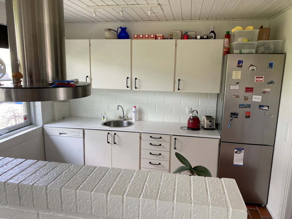 Cosy guest house, which is an independent building on the old school . The flat is 51m2 and has a lovely south-facing private 28m2 terrace. Combined kitchen and living room, a toilet/bath, an entry hall and a bedroom with one queen size bed and two bunk beds. The terrace is furnished with garden furniture, and there is wifi, tv, cromecast and parking near the entry door. Two extra beds can be made in the living room. Bonfire hut, tarzan track, hammocks and a large garden with playground.