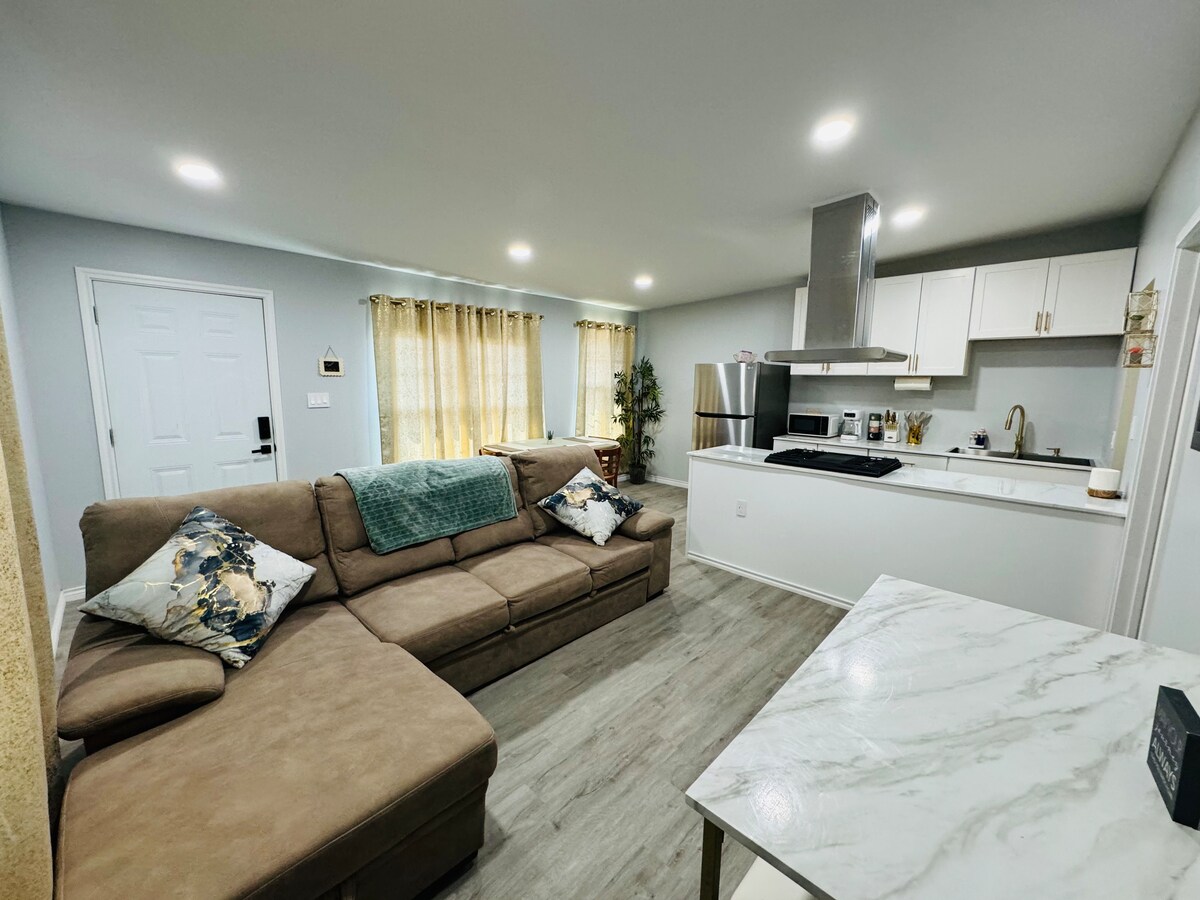 Naujai pastatytas be dūmų, 2 miegamųjų dvivietis kambarys pramoniniame rajone. Visiškai veikianti virtuvė, įrengtas kavos baras, skalbykla, belaidis internetas, dvi ne gatvės automobilių stovėjimo vietos ir išmanusis televizorius kiekviename kambaryje. Leidžiama apsistoti su augintiniais. Paprašius galima gauti pripučiamų čiužinių. Tarp viešnagių visi paviršiai dezinfekuojami/nuplaunami už 10 mylių nuo medicinos centro.