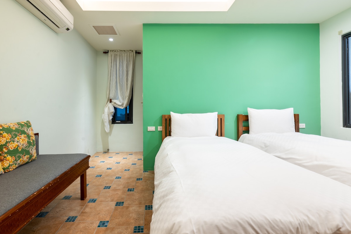 Dvivietis kambarys su vaizdu yra antrame namo aukšte. Turite lipti laiptais (jei turite pagalvoti apie savo mobilumą). Meiluno kalno ir Meilun Creek vaizdas yra už lango. Kambarys yra erdvus ir patogus. Įsikūręs ant Meilong Creek krantų Hualien mieste, netoli traukinių stoties, 5 minučių pėsčiomis yra patogumų parduotuvių, studijų, KTV ir įvairių užkandžių. 10