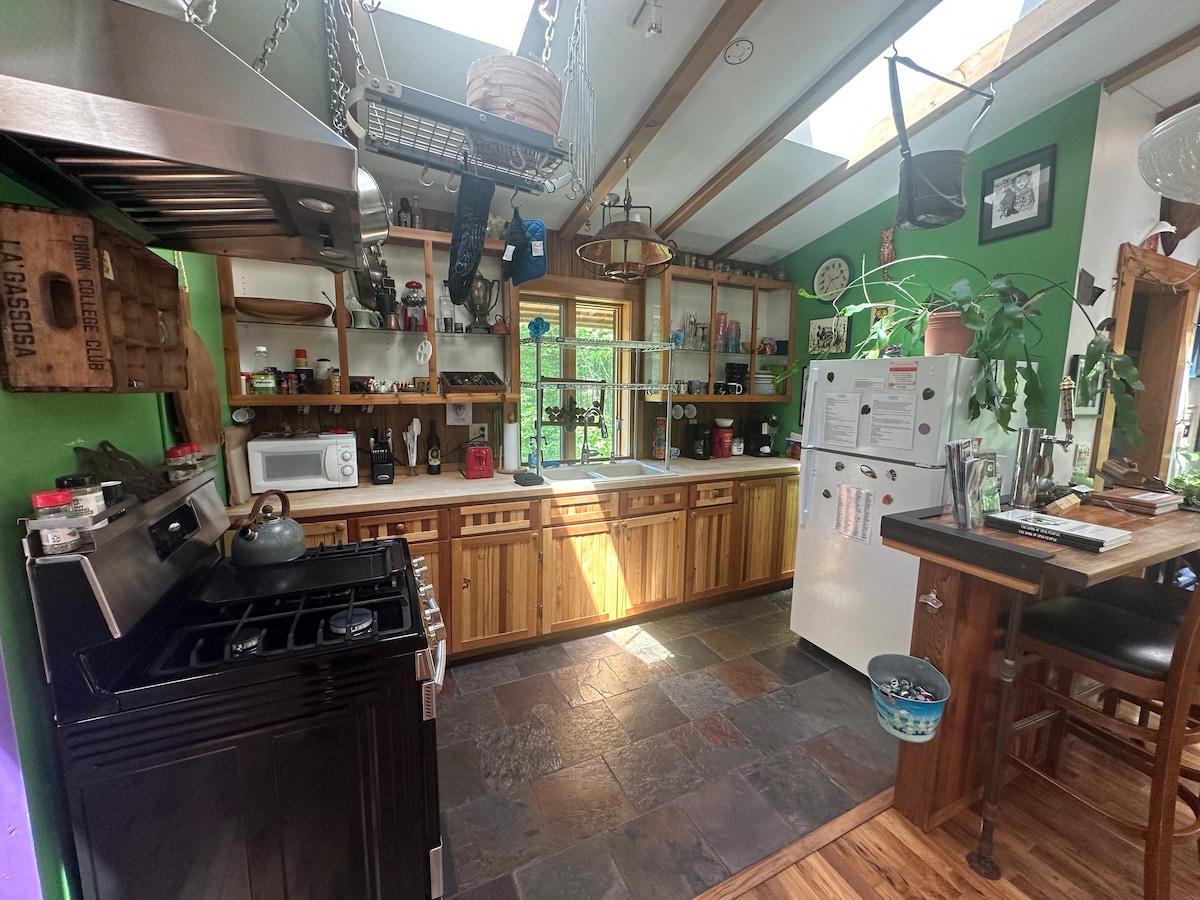 Mėgaukitės ramia viešnage šioje jaukioje, kūrybiškoje erdvėje. Šis kotedžas, įsikūręs ant 10 akrų sodų ir miškų, puikiai tinka tyrinėti Vakarų Masačusetsą - tokios vietos kaip MoCA, Shelburne Falls, Tanglewood ir Northampton vos už 30 min. kelio automobiliu. Viršuje yra dvigulė lova ir pilna vonia, o apačioje - funkcionali virtuvė, darbo stalas, dideli langai ir gyvenamoji erdvė su miegamąja sofa. Gyvename pagrindiniame nuosavybėje esančiame name, bet gerbiame jūsų privatumą - žr. nuotraukas!