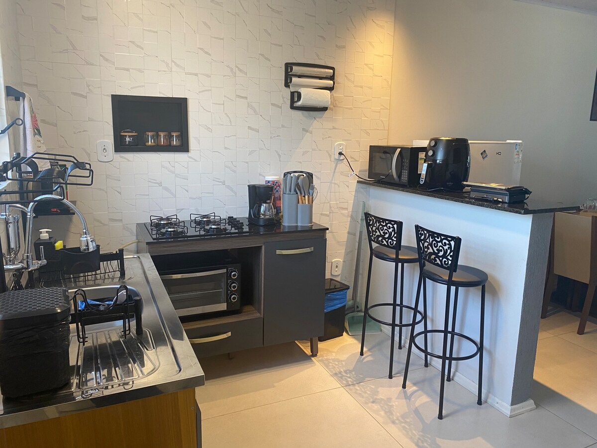 Nauja studija, įsikūrusi privilegijuotoje miesto vietoje! Įsikūręs priešais Jardim do Castelo rajoną, jis yra netoli vaistinės (50 m), restoranų ir barų(300 m), taip pat degalinių (60 m). Be to, jis yra už 5 min. kelio iki miesto centro ir 5 min. kelio iki IFSul - Campus Bagé. Bute yra baldai, nauji prietaisai, oro kondicionierius, virtuvės reikmenys, filtruotas vanduo, 32colių televizorius - visa tai skirta priimti jus su puikiu komfortu ir ramybe. Jame yra vieta automobiliui!