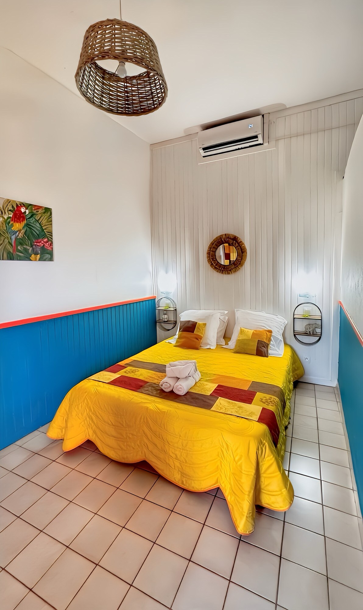 Magnifique bungalow de charme avec vue baie des Saintes comprenant une chambre climatisée avec 1 lit king size ou 2 lits en 90, télévision, salle de douche, séjour, cuisine équipée avec lave linge et lave vaisselle, machine à café, bouilloire, grille pain, wifi, lit BB disponible avec moustiquaire, très belle terrasse jardin. Parking avec prise pour charger une voiture tte électrique.