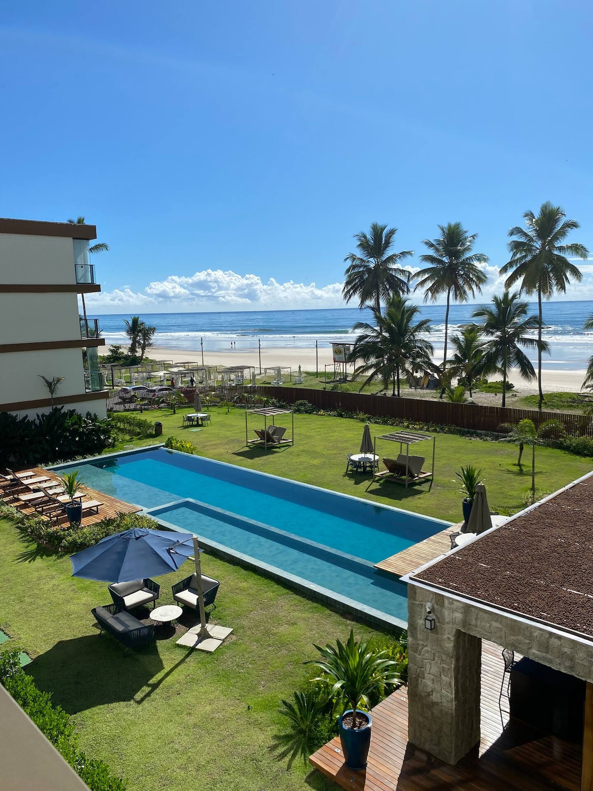 Apartamento na Praia dos Milionários, com vista frontal para o mar! São 2 quartos, ar-condicionado em todos os cômodos, Wi-Fi, sala ampla, cozinha equipada, varanda com vista para o mar, 2 banheiros (social e suíte) e vaga de garagem. Em frente à praia, basta atravessar a rua! Condomínio com segurança 24h, piscina de borda infinita, área de lazer completa e elevador. Conforto, praticidade e visual inesquecível para sua estadia no litoral baiano.