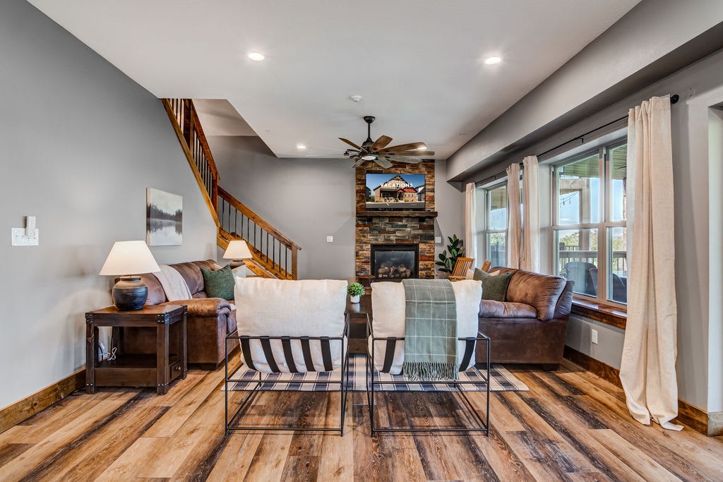 Pabėkite į šį gražų 2 miegamųjų, 2 vonios kondominiumą, esantį antrame aukšte, iš kurio atsiveria nuostabūs vaizdai į ežerą! Yra privati terasa, idealiai tinkanti ramiems rytams ar atpalaiduojantiems vakarams. 3 minutės pėsčiomis iki Fall Creek Marina. Vos 20 min. iki Silver Dollar City ir Branson Landing. Mėgaukitės pilnai įrengta virtuve, didelės spartos internetu, išmaniuoju televizoriumi ir žaidimais šeimai. Užsisakykite dabar ir mėgaukitės gyvenimu prie ežero. Nerūkoma.