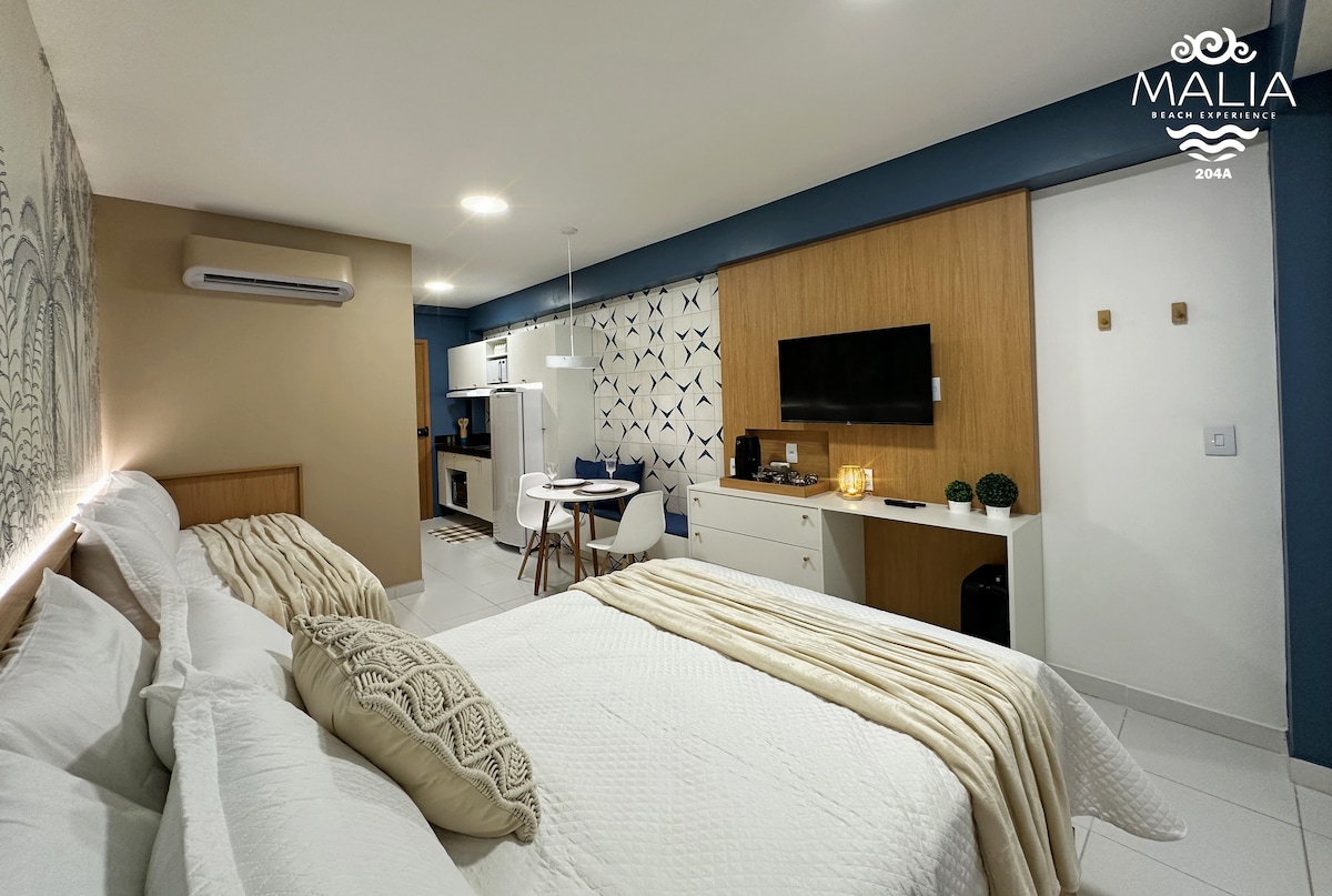 ✨Viva dias inesquecíveis em Muro Alto no Flat 104A do Malia Beach! A poucos passos da praia, com vista para o parque aquático, acomoda até 4 pessoas com muito conforto. Cozinha equipada, Wi-Fi de 500 mega, ar-condicionado e enxoval completo. O condomínio, estilo resort, tem lazer completo: piscinas, restaurante, recepção 24h, brinquedoteca, parque infantil, salão de jogos, campo de futebol, academia e rooftop.Perfeito para quem busca conforto, diversão e descanso em Porto de Galinhas.