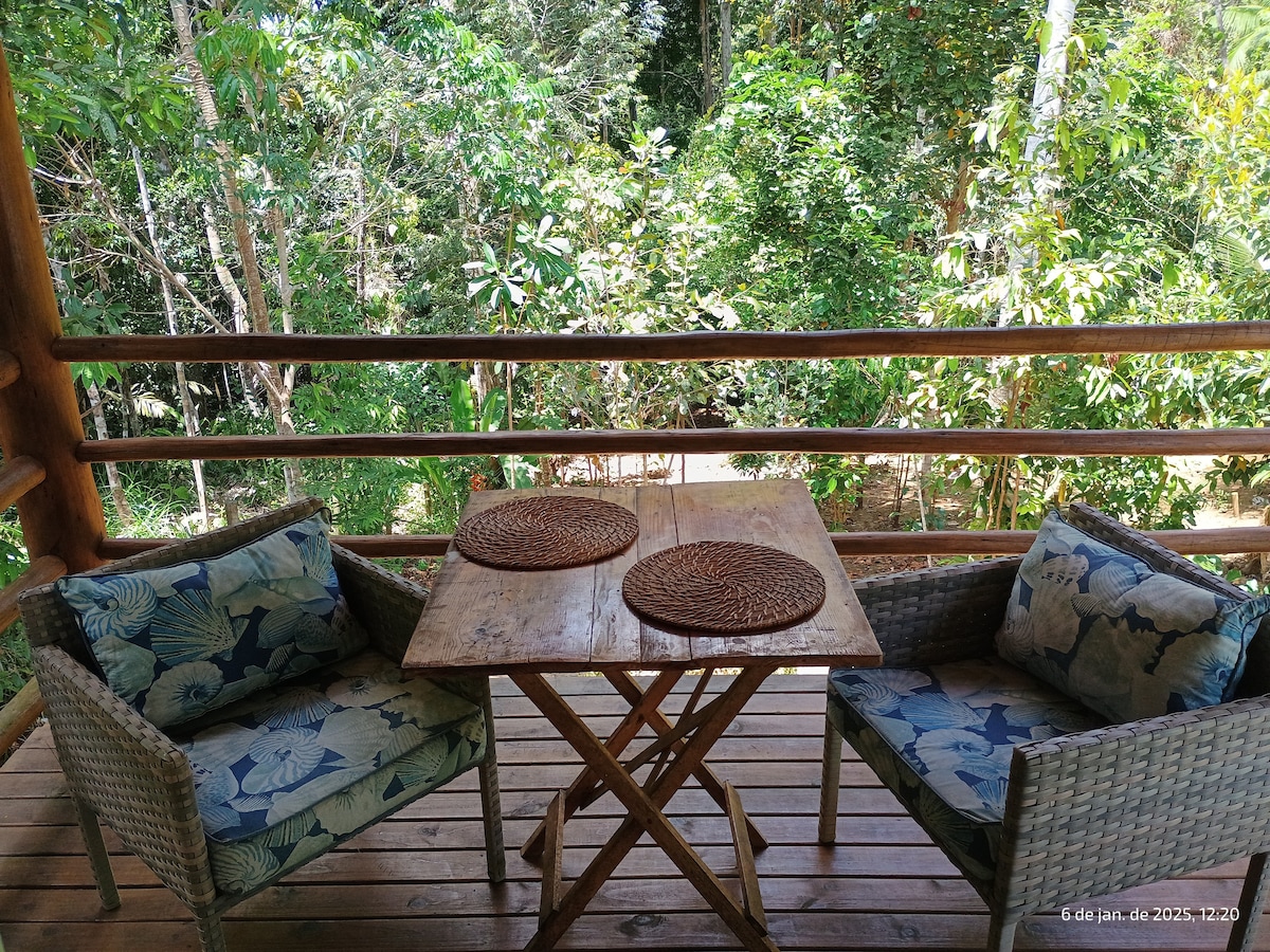 žavinga medinė trobelė su balkonais ir maža biblioteka su knygomis apie gamtą ir gyvenimą. Platus kraštovaizdis iki jūros nuo kalno viršūnės 100 metrų iki jūros lygio. Taika ir saugumas, už 2 km nuo draugiško Serra Grande kaimo. Laukinės gamtos prieglobstis: maži primatai, tinginiai, pekarai ir skruzdėlės. Tradicinių kakavos, maniokų, kokosų ir paukštienos ūkininkų regionas. banglenčių įranga, baidarės, važiavimas dviračiu.