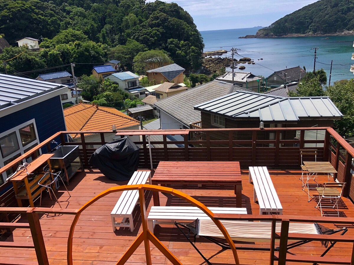 Iš visų kambarių atsiveria vaizdas į vandenyną ir geriausia snorkelio vieta priešais jus. Iki Ohura pakrantės yra 2 minučių pėsčiomis. 鍋田浜までも徒歩5分! 共有スペースにはキッチン、冷蔵庫、畳の小上がり、ウッドデッキがあります! ウッドデッキでは海を眺めながら、Kepsniai ant groteliųもご利用頂けます! Mūsų svečių namuose yra kambarys su vaizdu į vandenyną. 5 min. pėsčiomis iki Nabetos paplūdimio! Jei norite išbandyti snorkelį, mūsų būstas yra geriausia vieta! Mūsų bendra erdvė / virtuvė, šaldytuvas, Tatami erdvė, medinė terasa. Galite pasimėgauti kepsnine su vaizdu į vandenyną prie medinės terasos!