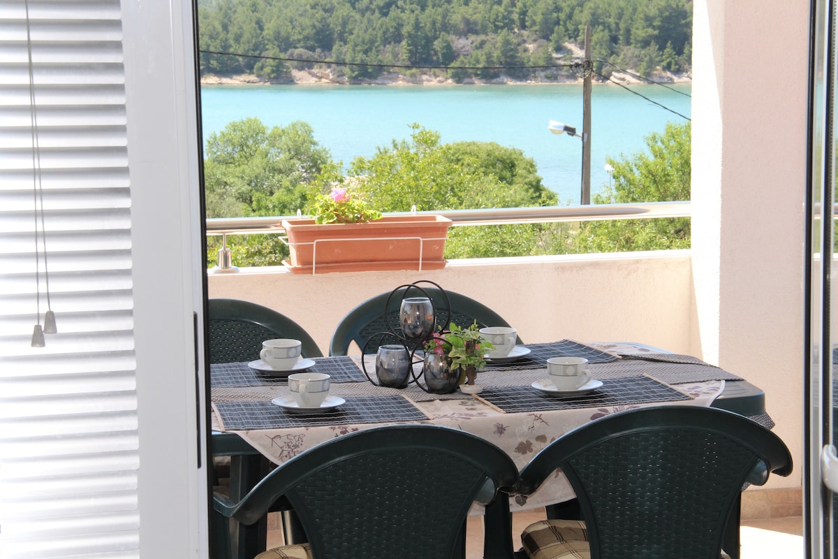 Butas yra Žaborić centre, 12 km nuo Šibeniko. Viduje 62 m2 + 14 m2 terasa. Atstumas nuo jūros yra 40 m, o nuo paplūdimio - 60 m. Netoliese yra restoranai (už 50 m), kavinės (už 30 m) ir vaikų žaidimų aikštelė (40 m). Butas yra pirmame namo aukšte. Jį sudaro du miegamieji, virtuvė-valgomasis, vonios kambarys ir svetainė, sujungta su erdvia terasa su vaizdu į sodą, jūrą ir salas. Sveiki atvykę į mūsų butą