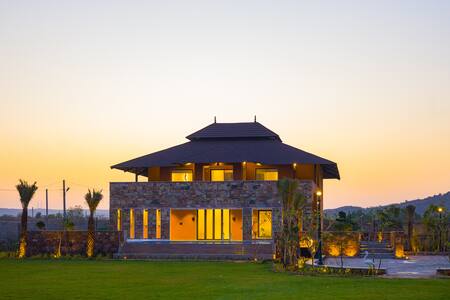 6 dideli 335 SFT dydžio kambariai su prijungtu vonios kambariu, kuriame yra vonia ir tualeto zona, „Lush Green Garden“, darbo stalas, spinta, televizorius, kondicionierius, arbatos/kavos virimo aparatas, spartusis internetas, elektroninis seifas. Kambariai su gražiai įrengtais baldais, išryškinant vietinę kultūrą ir „Mėlynos keramikos“ tematikos baldus. Name yra pilnai įrengtos 2 virtuvės, didelė valgomoji erdvė ir atviri vestibiuliai. Namą sudaro 2 aukštai, nėra lifto. 2500 SFT pusrūsių salė su atskiru įėjimu. Stalo tenisas ir kiti vidaus žaidimai.