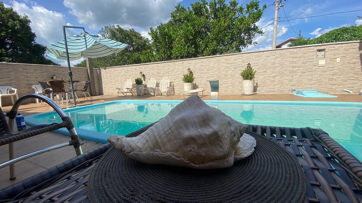 Chácara Inteira NOVA! Rotušė 20 žmonių apgyvendinimui ir 40 nedideliems renginiams. Graži kaimiška caúcara, su 4 dideliais apartamentais, kambariu su aukšta tiesiogine koja ir židiniu, integruota aplinka, sudaro unikalią erdvę. Svetingas projektas, atsipalaidavęs ir apgalvotas kiekvienoje smulkmenoje. Kepsnių zona, medinė viryklė ir picos krosnelė sujungtos su virtuve, iš kurios atsiveria vaizdas į žaliąją zoną ir šildomą baseiną! Mėgaukitės laužaviete geriems pokalbiams. Mielai juos gausiu.